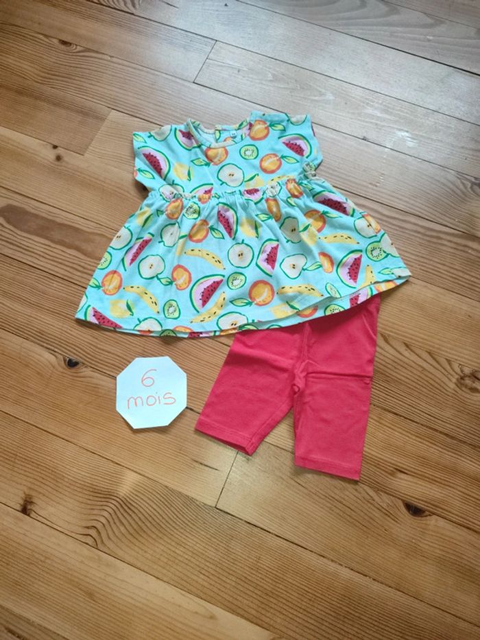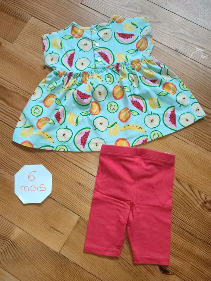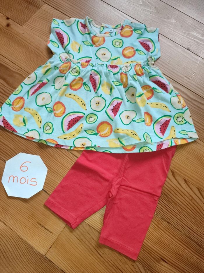 Ensemble tunique manches courtes, fermeture boutonnée dans le dos (vert pâle et motifs fruits) et legging rouge. Très bon état. Marque : inconnue Taille 6 mois #celine76590fille6mois