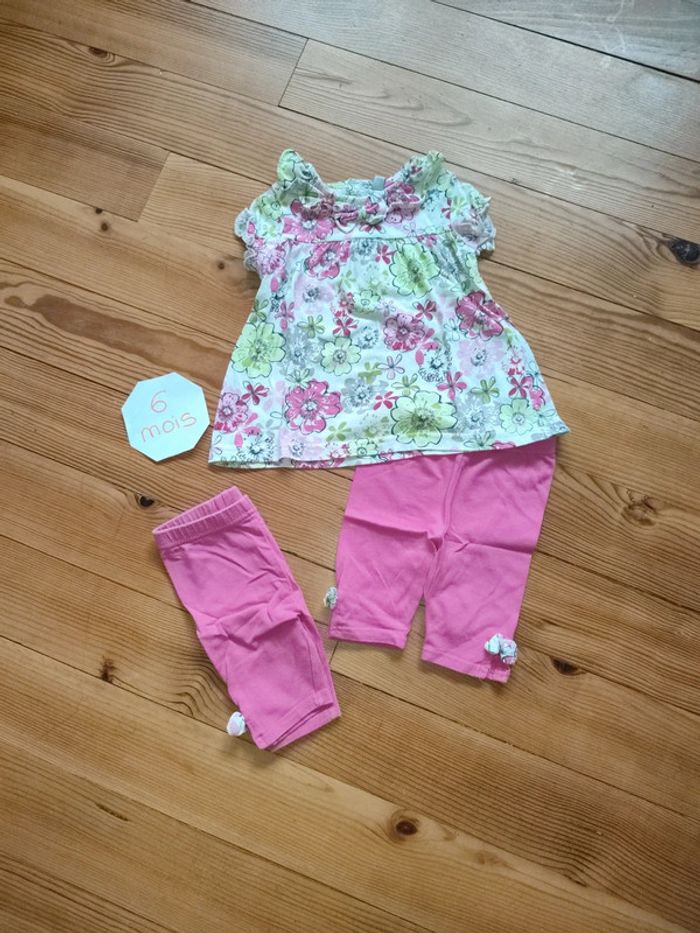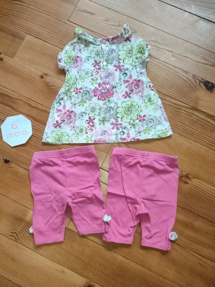 Ensemble tee shirt manches courtes, fermeture boutonnée dans le dos (blanc avec motifs fleurs rose et vert) et deux leggings rose. Très bon état. Marque : inconnue Taille 6 mois #celine76590fille6mois