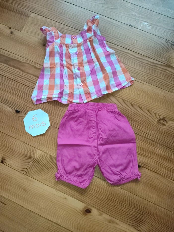 Ensemble blouse à bretelles, fermeture boutonnée dans le dos (rose, orange, blanche avec fleur en relief) et short rose. Très bon état. Marque : inconnue Taille 6 mois #celine76590fille6mois