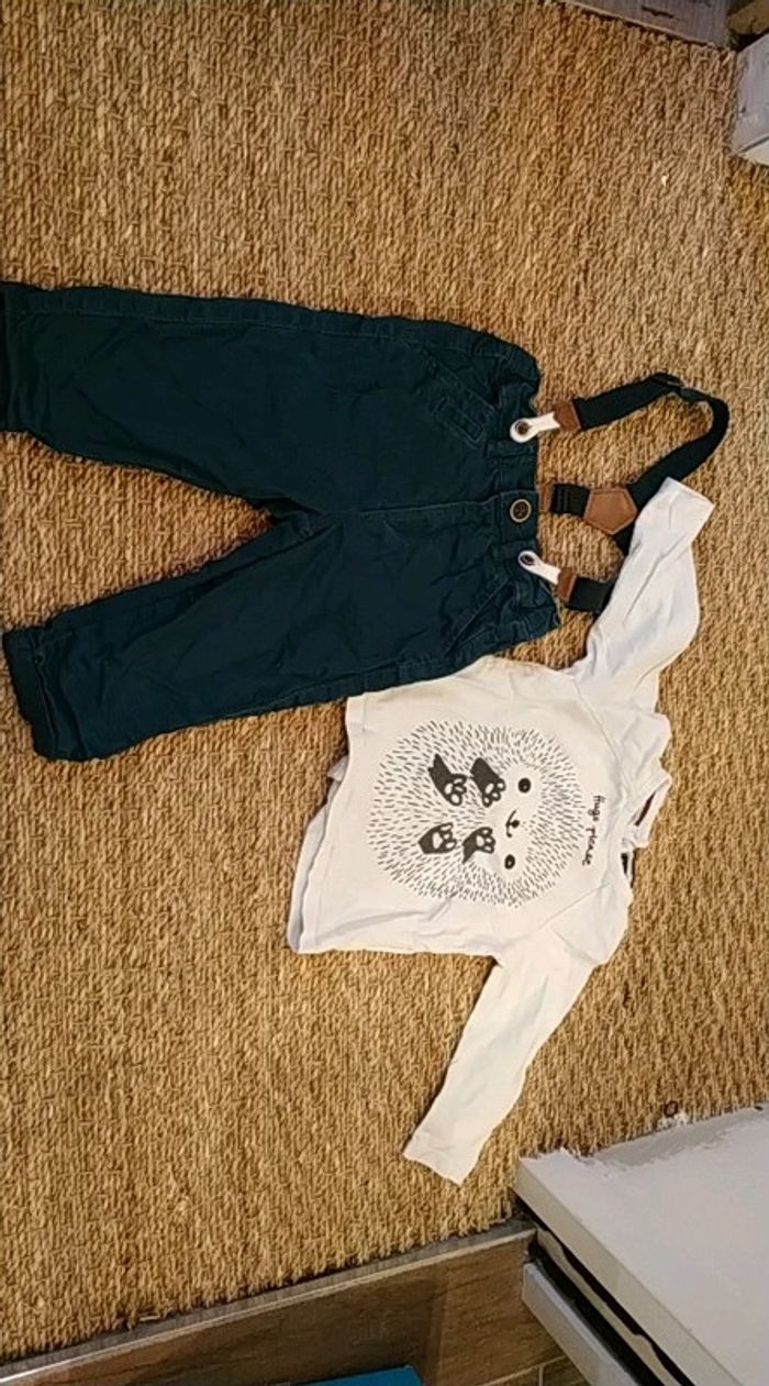 Excellent état Pantalon bleu canard avec bretelles T shirt manches longues avec hérisson Juste froissé