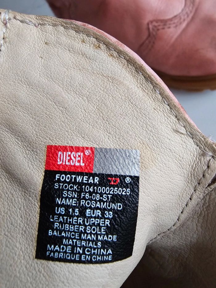 En cuir. Boit légèrement abîmé cat porte mais en bon état niveau semelle et intérieur Elles ont été imperméabilisées ce qui fait ressortir les défauts sur la photo, en vrai c'est beaucoup moins visible.