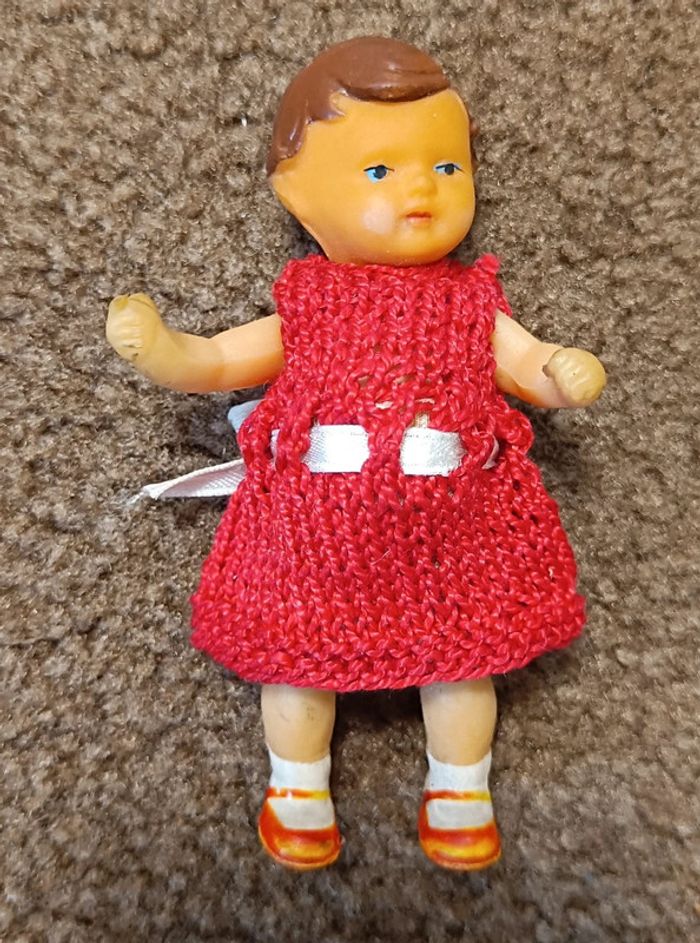 Petite poupée vintage allemande en caoutchouc Ari Baby Doll - 1960s Yeux bleus Mini poupée ancienne Robe crochet et tenue vêtements maison non fumeur et sans animaux n'hésitez pas à faire des lots figurine collector jouet poupée peluche vintage