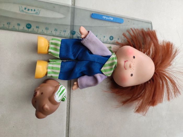 poupée charlottes aux fraises huckleberry pie + figurine chien clafouti pistache clafouti myrtilles 1979 american greetings avec chaussures et son chien collector, collection vintage n'hésitez pas a faire des lots