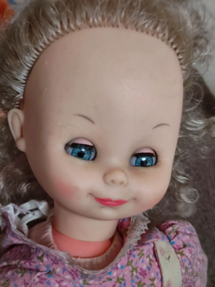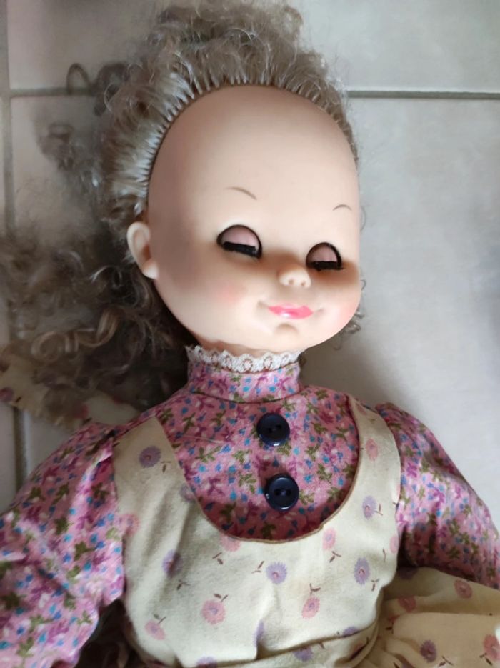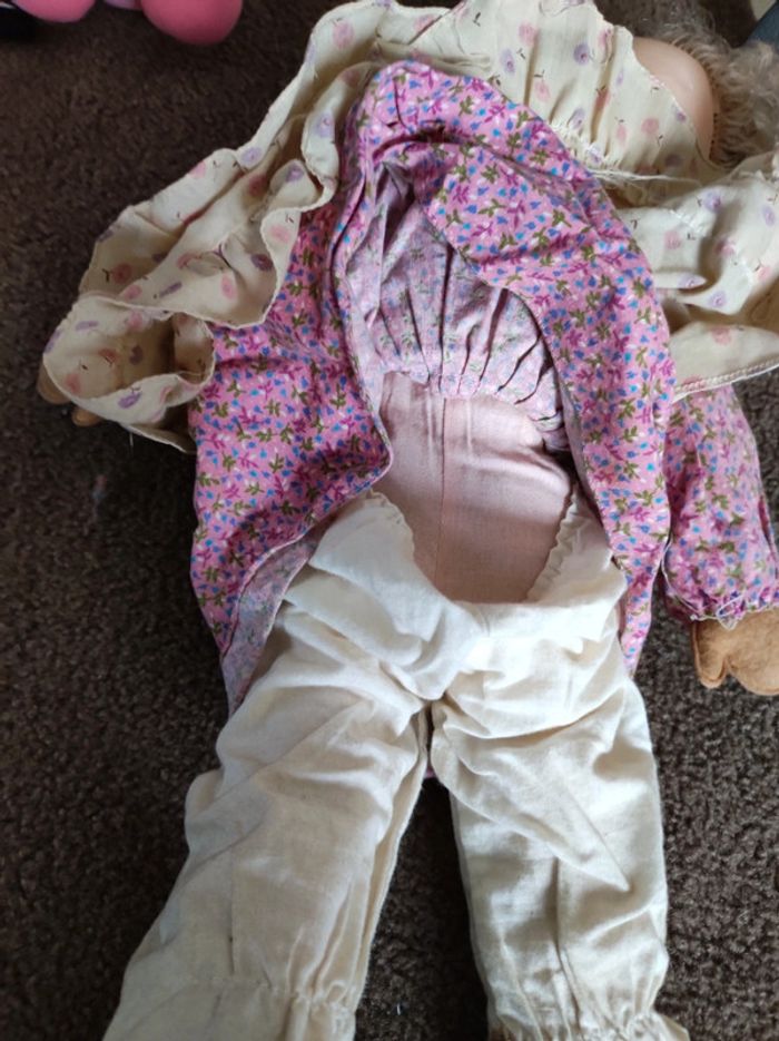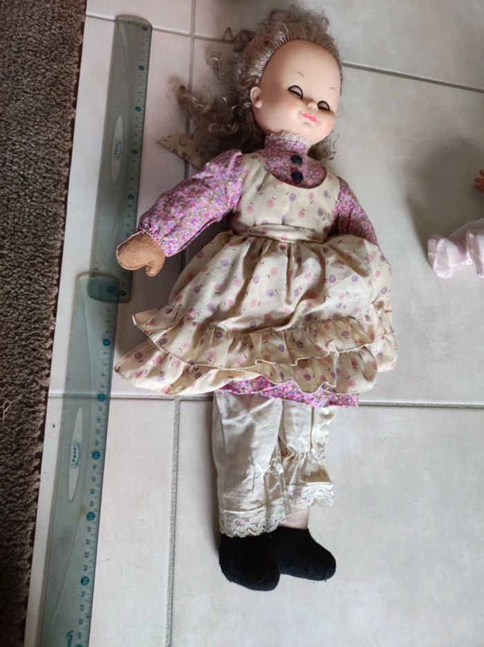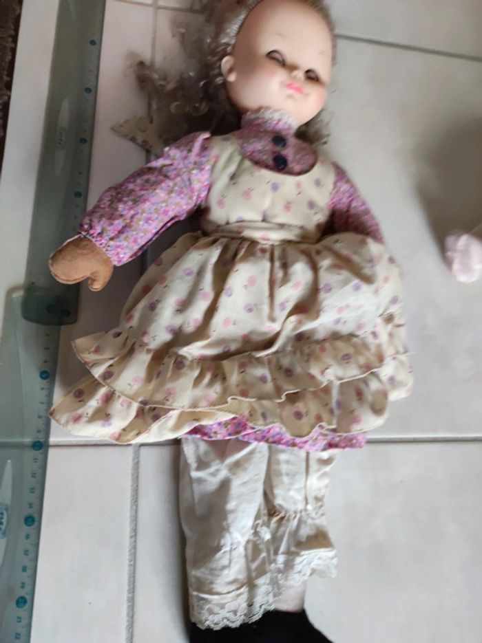 corps chiffon tete plastique poupée ancienne yeux bleus robe tablier fleurie collector collection vintage maison non fumeur et sans animaux n'hésitez pas à faire des lots