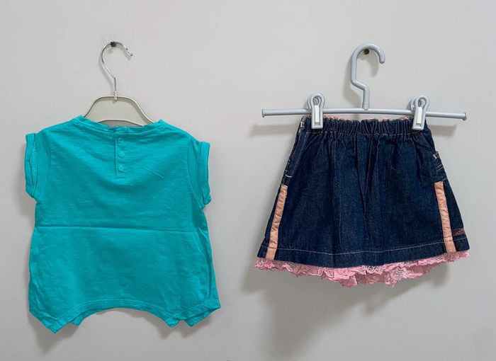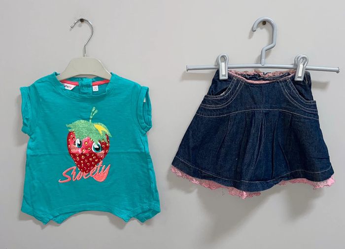 Ensemble 2 pièces : - Tee-Shirt Manche Courte Taille 18 mois Marque Kiabi Très bon état - porté 1 fois - Magnifique Jupe Taille 18 mois Marque Kiabi Très bon état - porté 1 fois 6€ le lot Pleins d'autres annonces en 18 mois été/hiver en cliquant sur ce lien : #dressingcindydixhuitmois Lot possible pour économiser sur les frais de ports