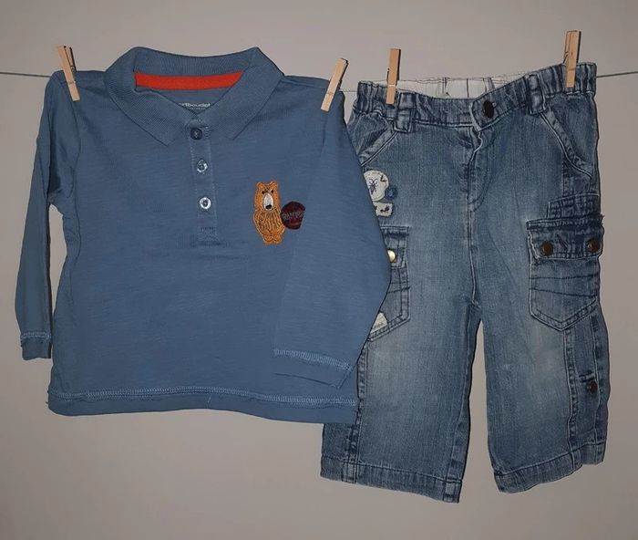 Ensemble 2 pièces Taille 12 mois - Polo Manche Longue Marque Vertbaudet Très bon état - Pantalon en Jean Taille élastique Marque Tout Simplement Très bon état 6€ le lot Pleins d'autres annonces dans cette taille en cliquant sur ce lien : #dressingcindydouzemois
