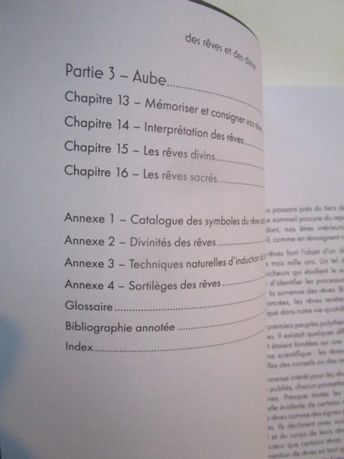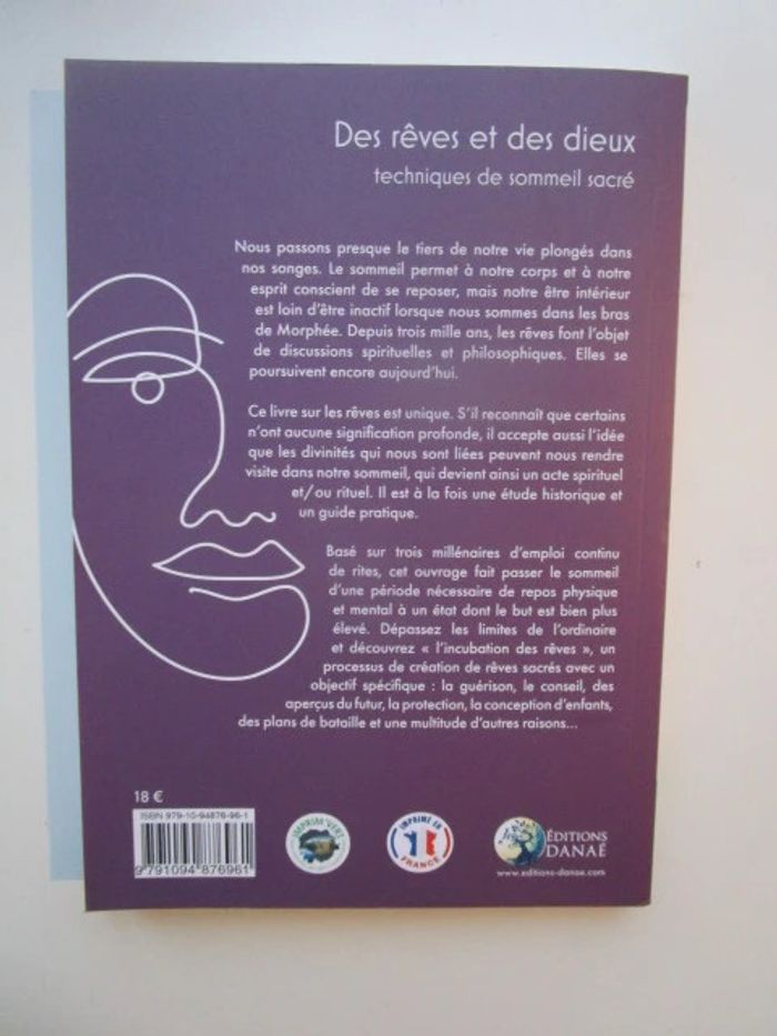 Nous passons presque le tiers de notre vie plongés dans nos songes. Le sommeil permet à notre corps et à notre esprit conscient de se reposer, mais notre être intérieur est loin d'être inactif lorsque nous sommes dans les bras de Morphée. Depuis trois mille ans, les rêves font l'objet de discussions spirituelles et philosophiques. Elles se poursuivent encore aujourd'hui. Ce livre sur les rêves est unique. S'il reconnaît que certains n'ont aucune signification profonde, il accepte aussi l'idée que les divinités qui nous sont liées peuvent nous rendre visite dans notre sommeil, qui devient ainsi un acte spirituel et/ou rituel. Il est à la fois une étude historique et un guide pratique. Basé sur trois millénaires d'emploi continu de rites, cet ouvrage fait passer le sommeil d'une période nécessaire de repos physique et mental à un état dont le but est bien plus élevé. Dépassez les limites de l'ordinaire et découvrez "l'incubation des rêves", un processus de création de rêves sacrés avec un objectif spécifique : la guérison, le conseil, des aperçus du futur, la protection, la conception d'enfants, des plans de bataille et une multitude d'autres raisons... Éditeur ‏ : ‎ DANAE Broché ‏ : ‎ 238 pages Dimensions ‏ : ‎ 15 x 2 x 21.1 cm Livre NEUF! à offrir Je vends d'autres livres de la même collection #phil_peg_danae #rêve #sommeil #esprit #processusdecréation #incubation #divinité
