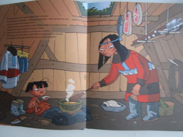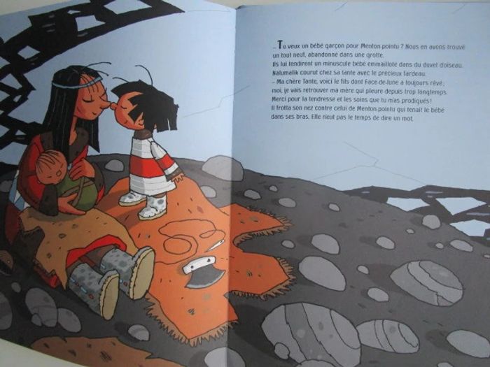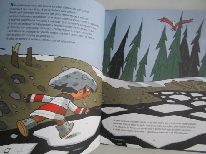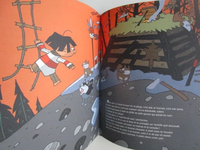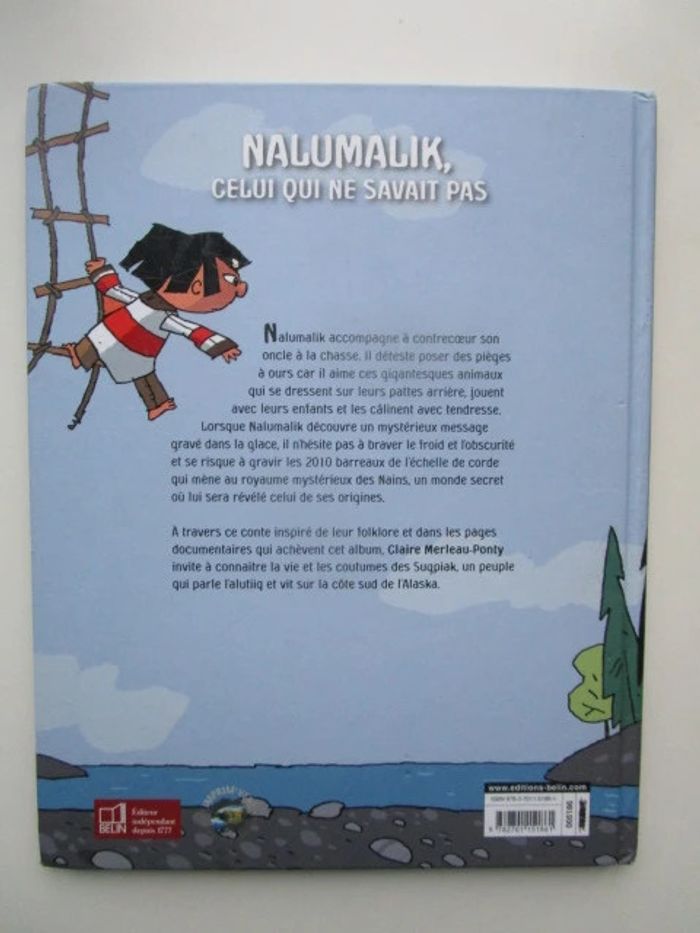 Nalumalik accompagne à contrecoeur son oncle à la chasse. Il déteste poser des pièges à ours car il aime ces gigantesques animaux qui se dressent sur leurs pattes arrière, jouent avec leurs enfants et les câlinent avec tendresse. Lorsque Nalumalik découvre un mystérieux message gravé dans la glace, il n'hésite pas à braver le froid et l'obscurité et se risque à gravir les 2010 barreaux de l'échelle de corde qui mène au royaume mystérieux des Nains, un monde secret où lui sera révélé celui de ses origines. A travers ce conte inspiré de leur folklore et dans les pages documentaires qui achèvent cet album, Claire Merleau-Ponty invite à connaître la vie et les coutumes des Sugpiak, un peuple qui parle l'alutiiq et vit sur la côte sud de l'Alaska. Éditeur ‏ : ‎ Belin 44 pages Âge de lecture ‏ : ‎ 4 - 7 ans Dimensions ‏ : ‎ 22.5 x 0.8 x 28.5 cm BD en état neuf #alaska #chasse #ours #conte #origine #message #coutumes #traditions