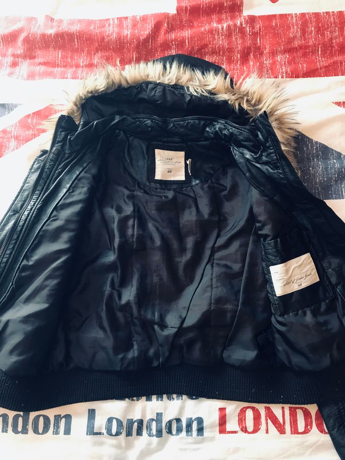 Veste marron foncé style aviateur de chez H&M. Taille 12/13 ans Entièrement doublée avec capuche à fourrure amovible et poche intérieur Fermeture par zip Matière synthétique lavable en machine à 40 En très bon état
