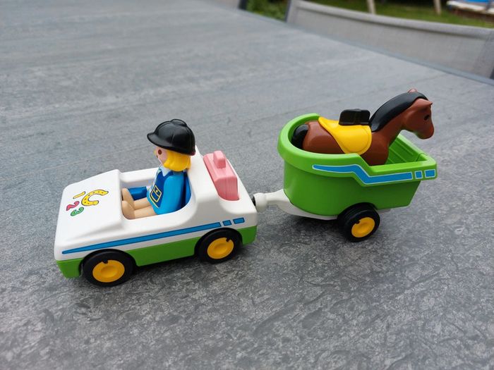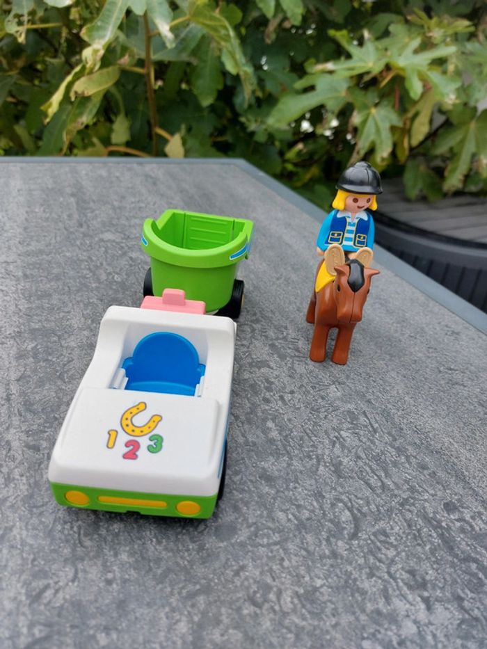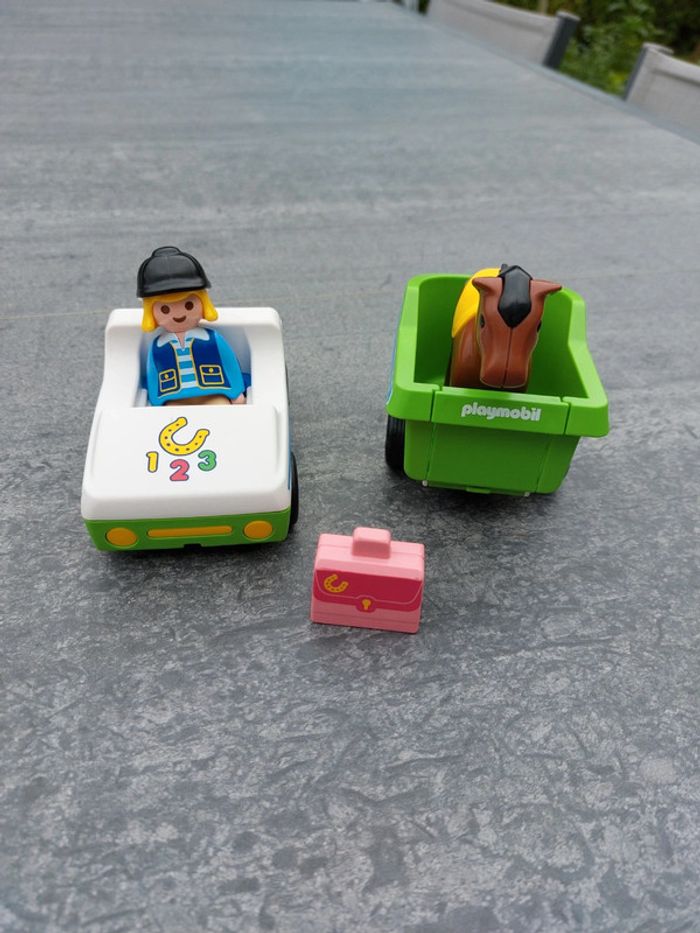 Cavalière playmobil 123 Avec la voiture, la remorque, le cheval, la cavalière et la sacoche de soin Très bon état