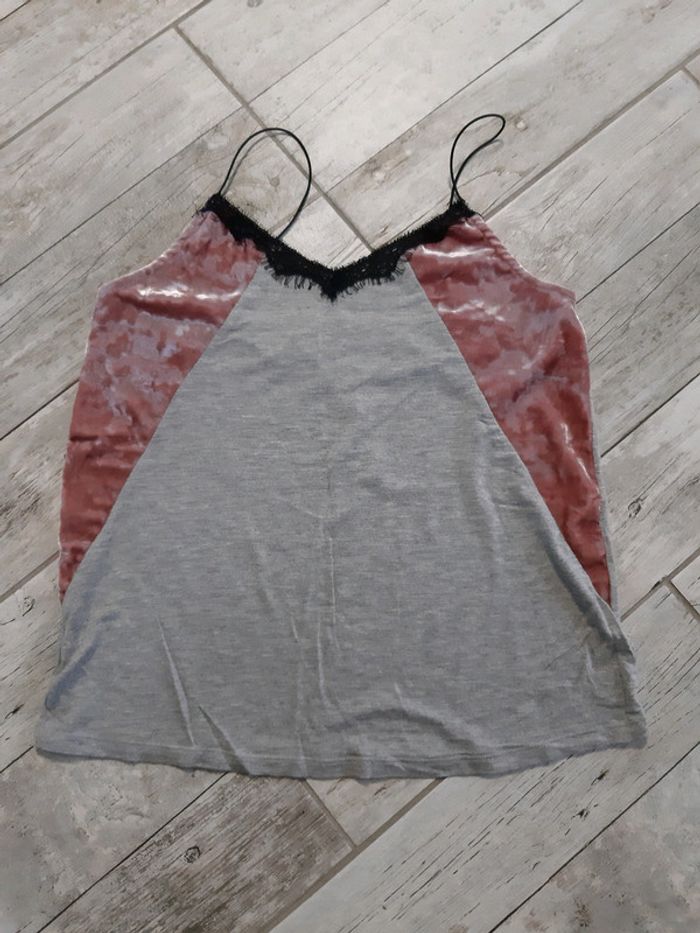 Débardeur gris et rose 36. Les bretelles ont été raccourcies mais non coupées s'il faut les rallonger Très bon état Plus d'étiquette, elles ont été coupées