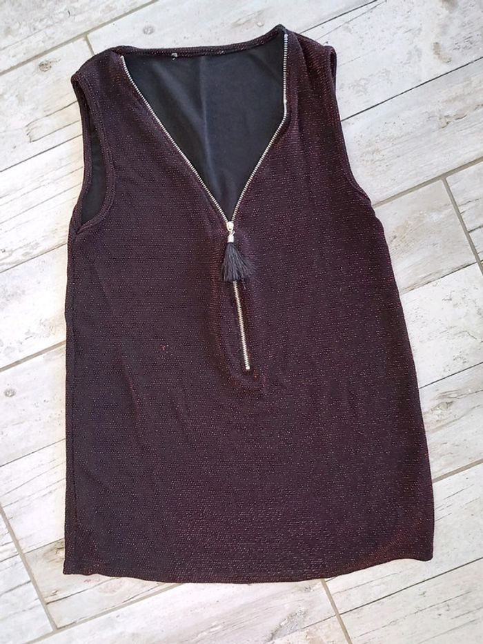 Haut noir avec détails rouges Taille 36 Très bon état Plus d'étiquettes, elles ont été coupées