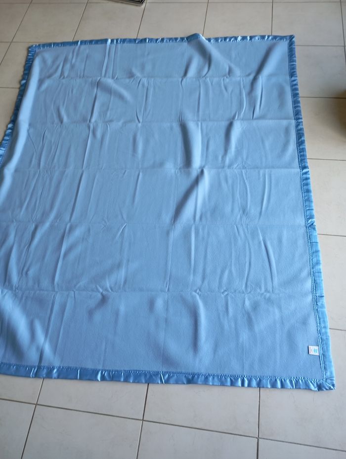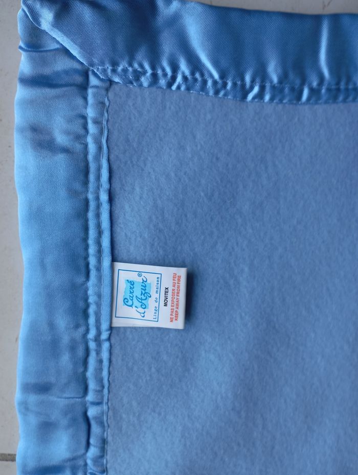 Couverture polaire avec satin sur tout le bord de la couverture neuve Couleur bleu clair Dimension 165x190 cm environ Marque carré d'azur 100%polyester
