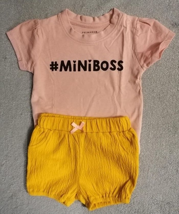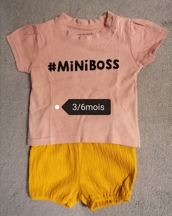 Ensemble bébé filles 2 pièces : T. Shirt : Marque primark. 3/6mois Couleur : rose pale Short : taille :3 mois. Couleur moutarde Cuisses élastiques. Ensembles portés, aucune tache 4.50€
