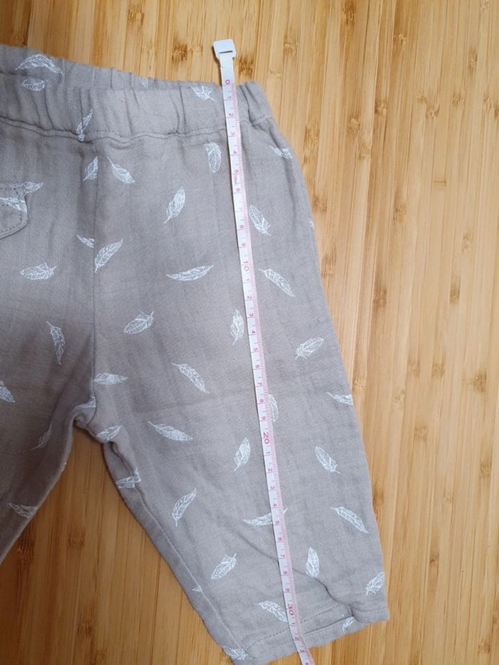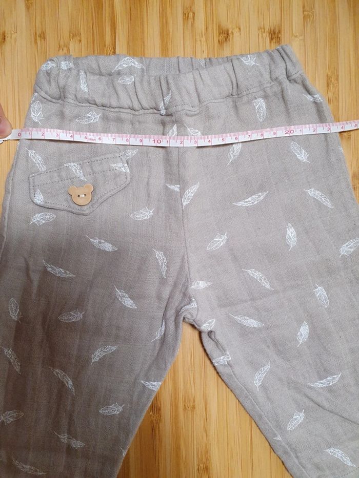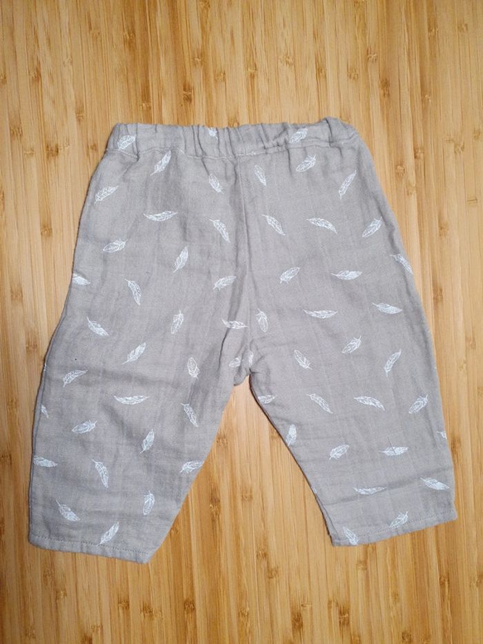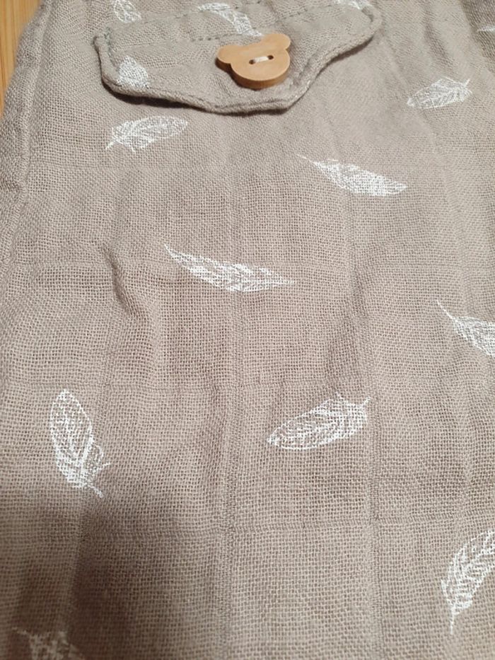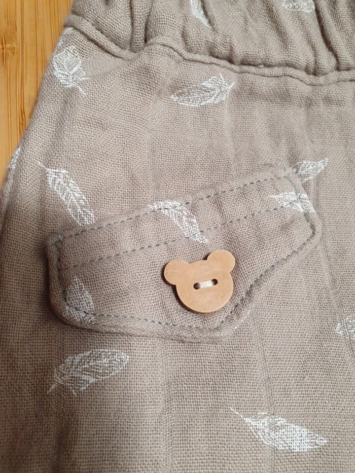 Étiquettes composition coupées, lin et coton 32 cm longueur x 24 cm Plumes Bouton ourson en bois F_09M_PA_1 Pantalon unisexe fille ou garçon #9moisfilleTropMimi #9moisgarconTropMimi
