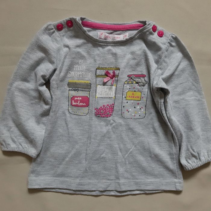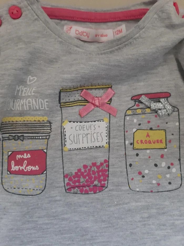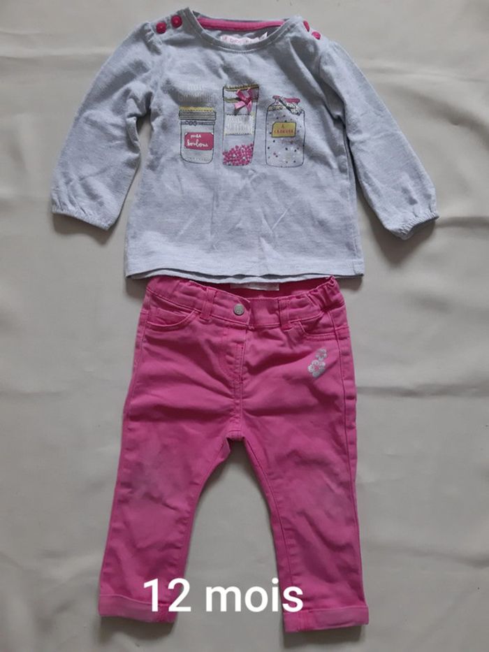 ensemble comprenant : - 1 t-shirt à manches longues gris, de la marque Gémo, en taille 12 mois 2 boutons roses sur chaque épaule pour faciliter l'enfilage motifs : bonbons cœurs roses sur les coudes inscription : Melle Gourmande - 1 pantalon en jean souple de couleur rose, de la marque Gémo, en taille 12 mois motifs : fleurs En très bon état. 🏷 Remises automatiques pour l'achat de plusieurs articles. Tout n'est pas encore en ligne. N'hésitez pas à me demander. Vêtements de la taille naissance à la taille 3 ans disponibles. Jouets et livres disponibles.