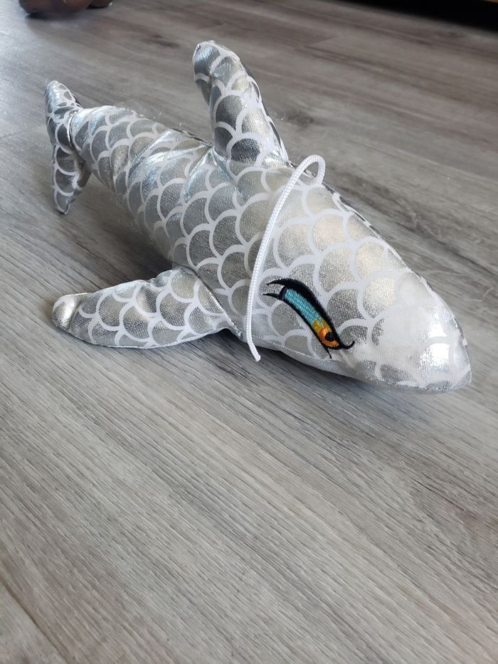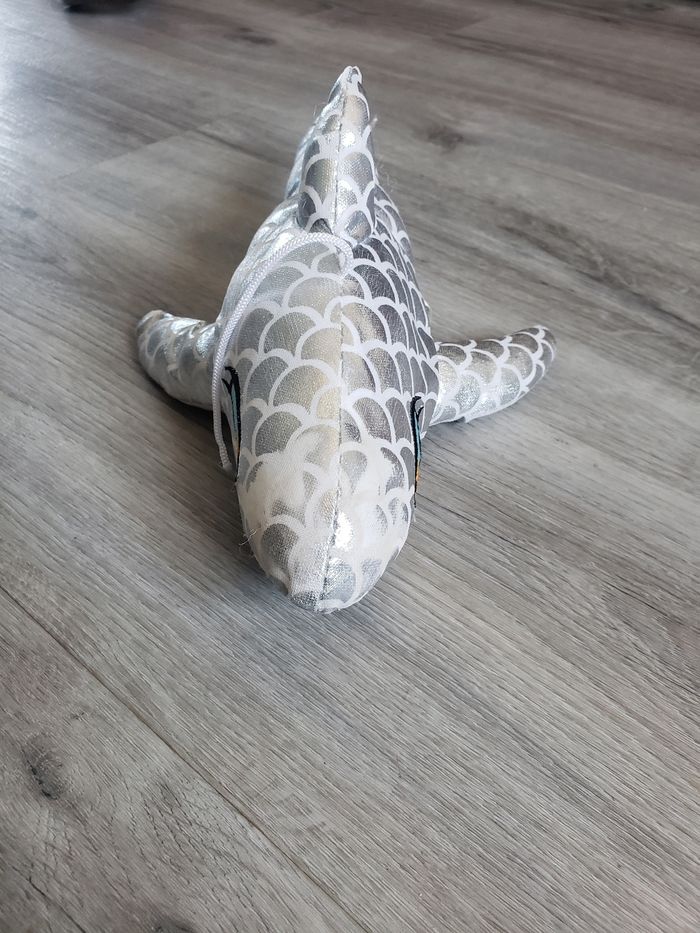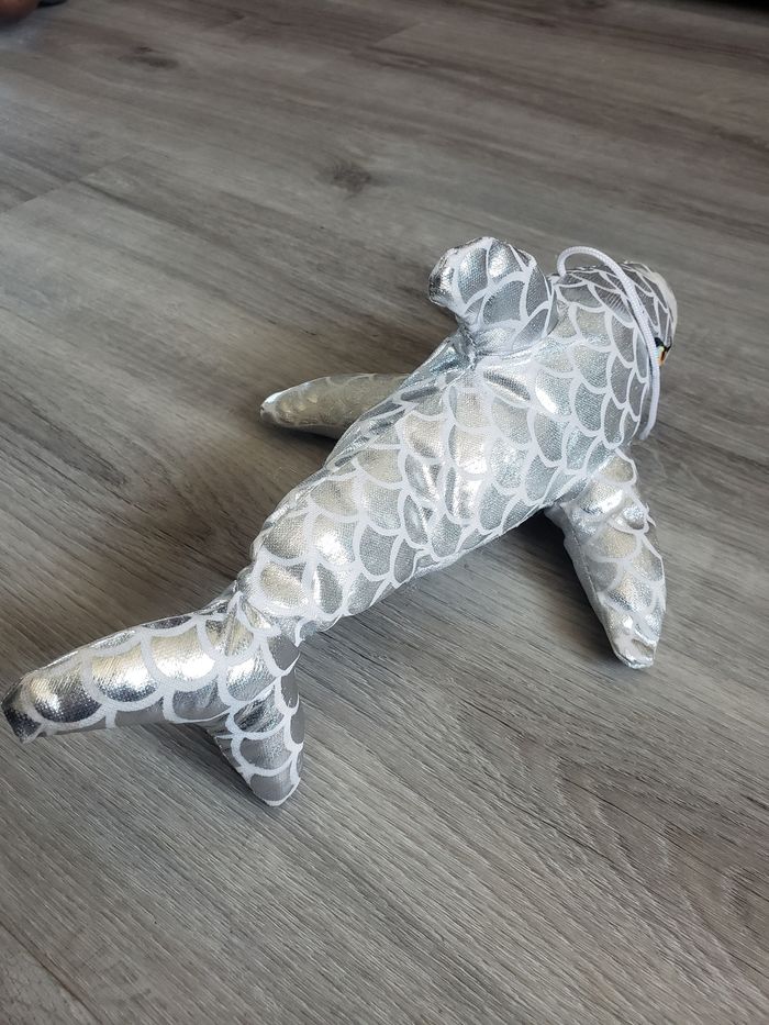 Peluche d'environ 25cm de long argentée brillant. Le revêtement argentée s'efface un peu sur le museau mais sinon en très bon état. Ficelle pour le suspendre.