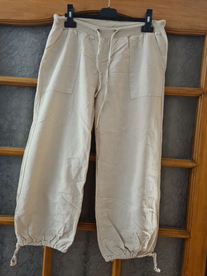 Pantacourt beige en coton et lin taille L un peu usé entre les cuisses