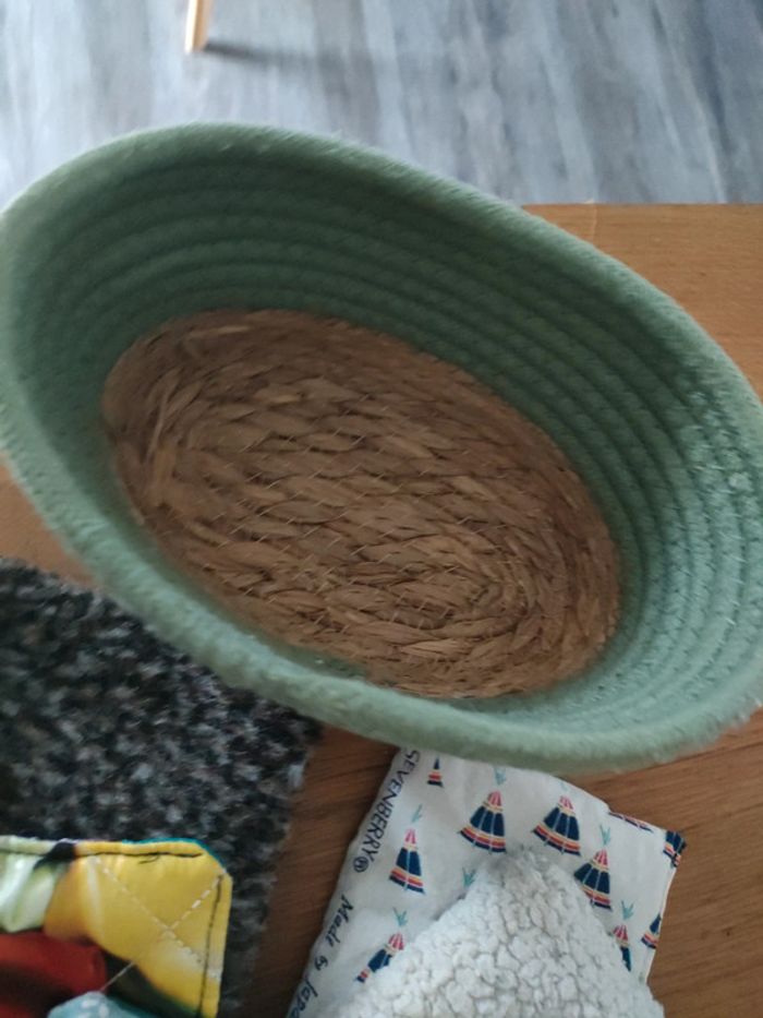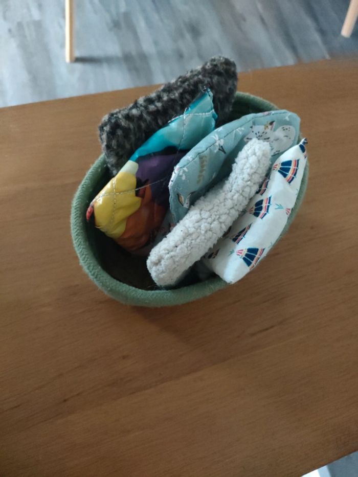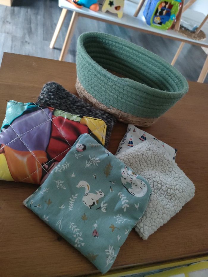Petits coussins sensoriel avec leur panière pour les premières découvertes de bruit et de texture de bébé, différentes matières les petits coussins sont remplis soit avec des petits grains de différentes tailles ou des boutons pour l'éveil des premiers sens.