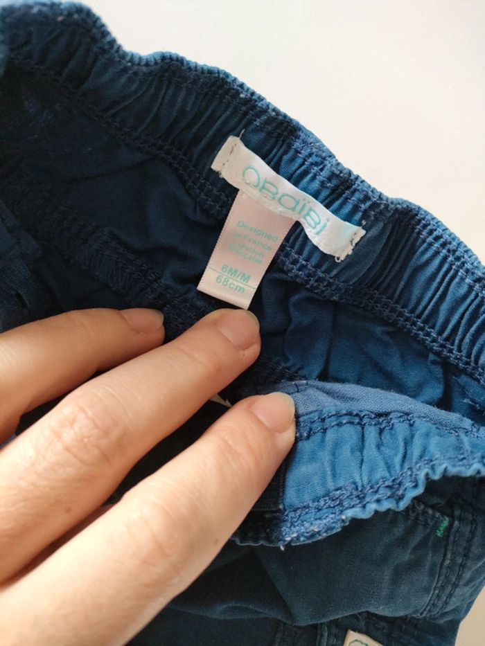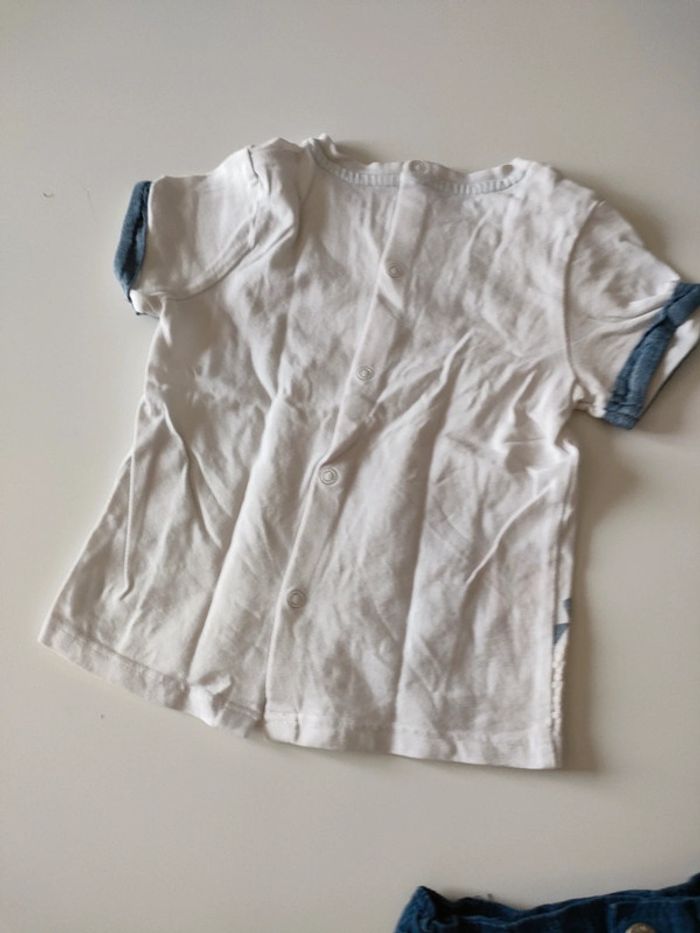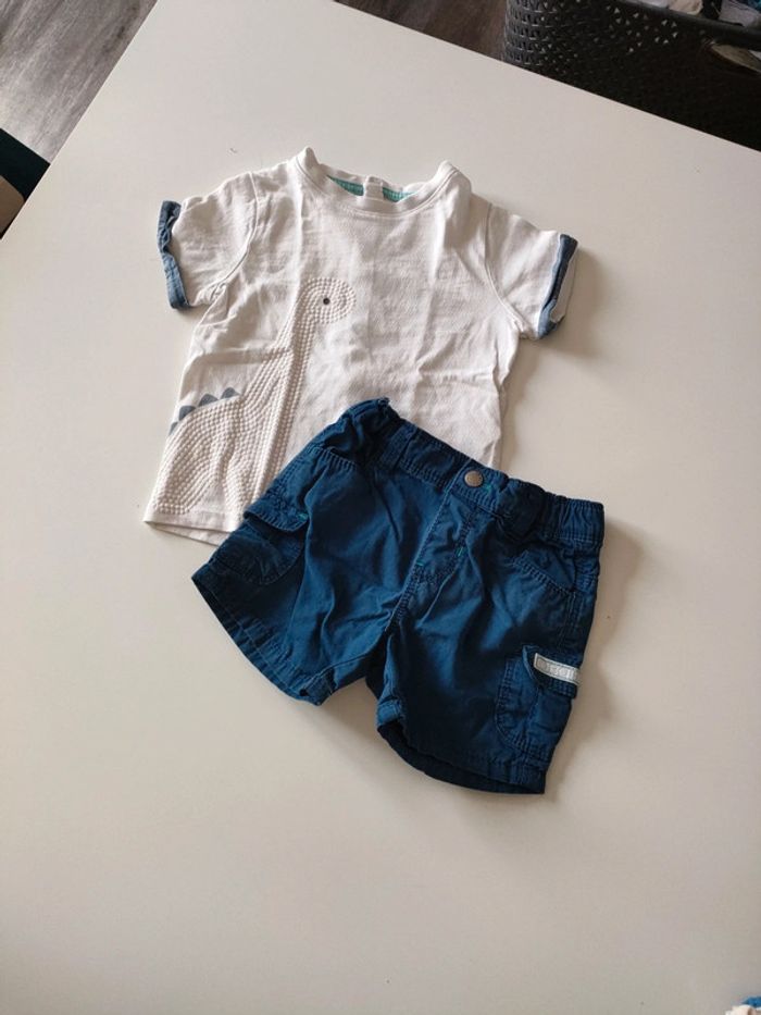 Ensemble de la marque obaibi taille 6 mois en très bon état, le t-shirt a une ouverture complète dans le dos et le short avec élastique à la taille pour régler et pression. Une toute petite tache sur le t-shirt voir photos mais vraiment pas grand-chose