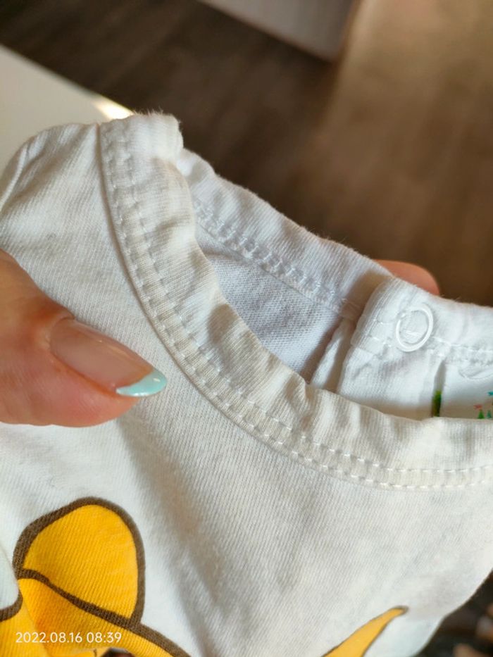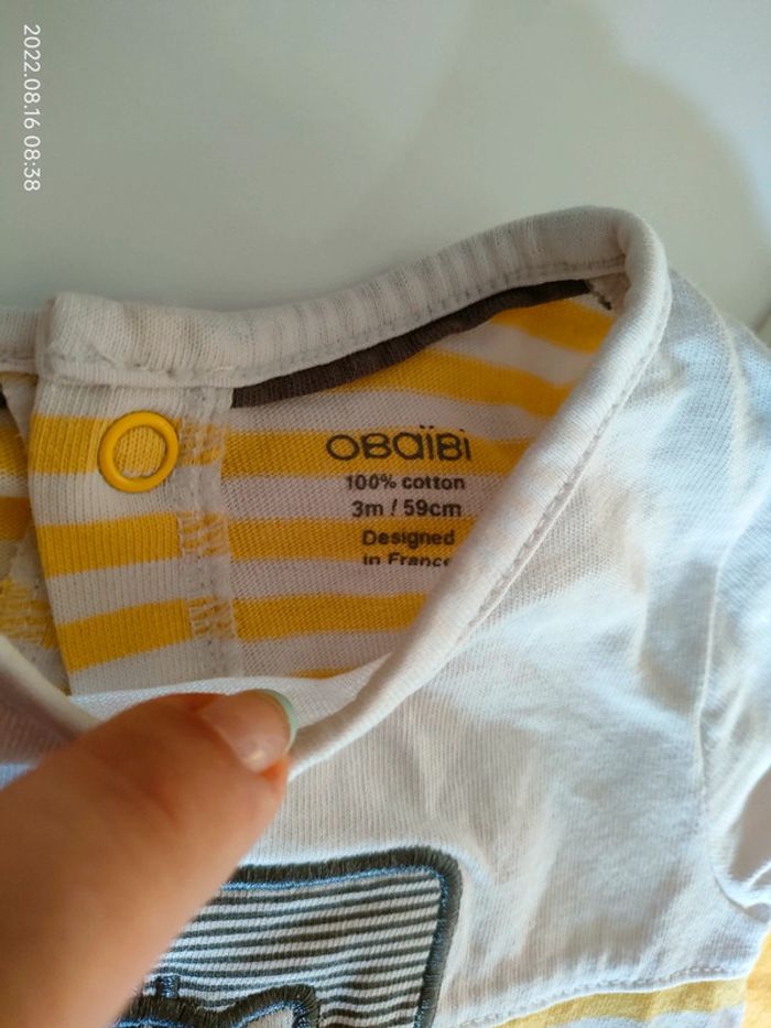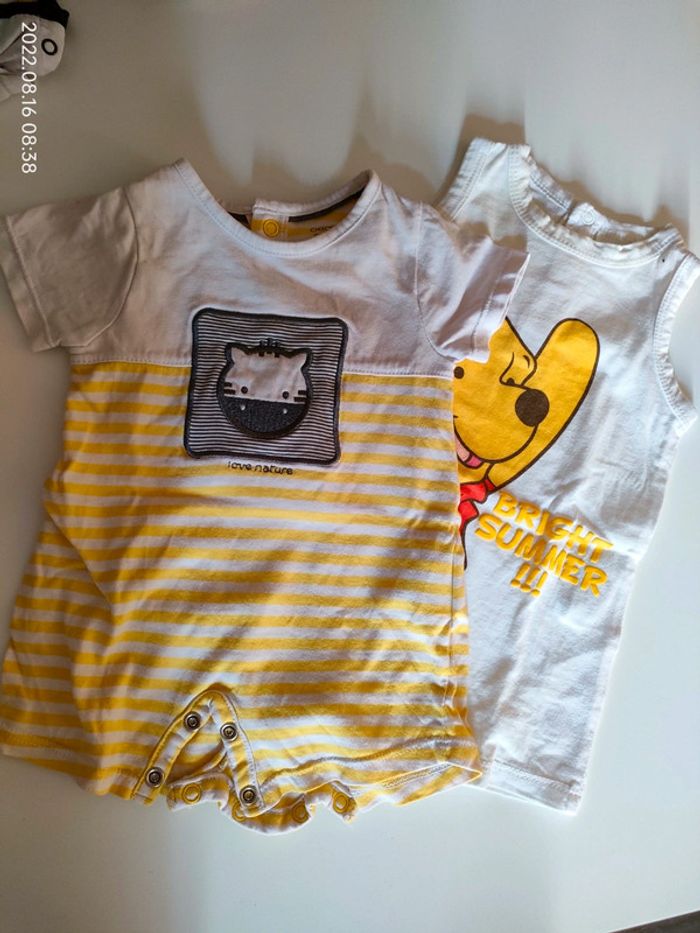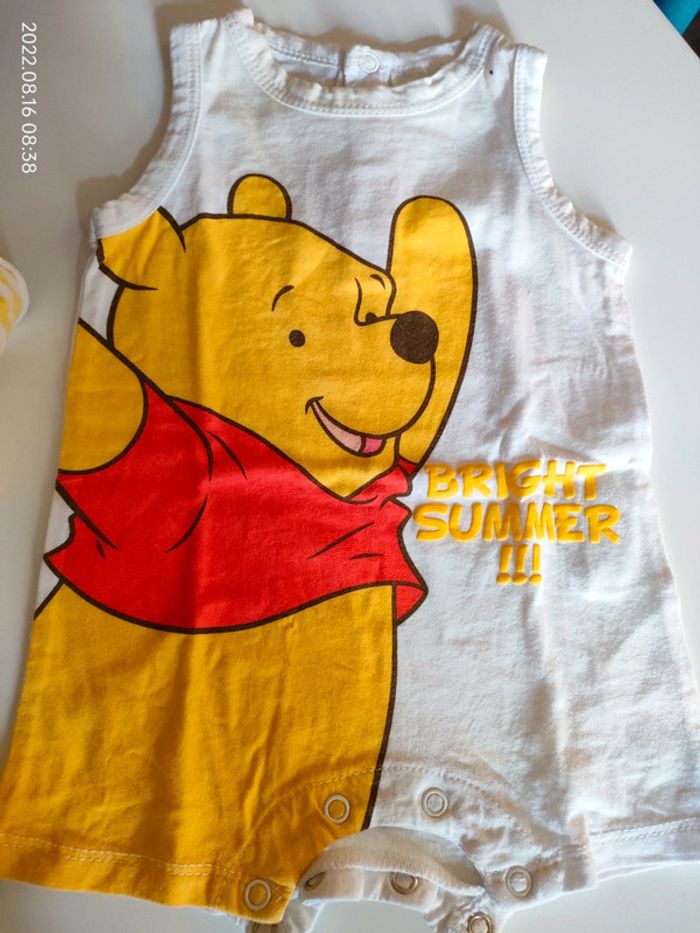 Lot de deux combinaisons été mixte taille 3 mois. La première obaibi en très bon état, la deuxième Winnie jaunit au niveau du col et une petite tache voir photos.