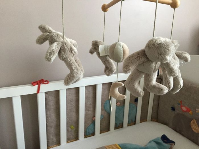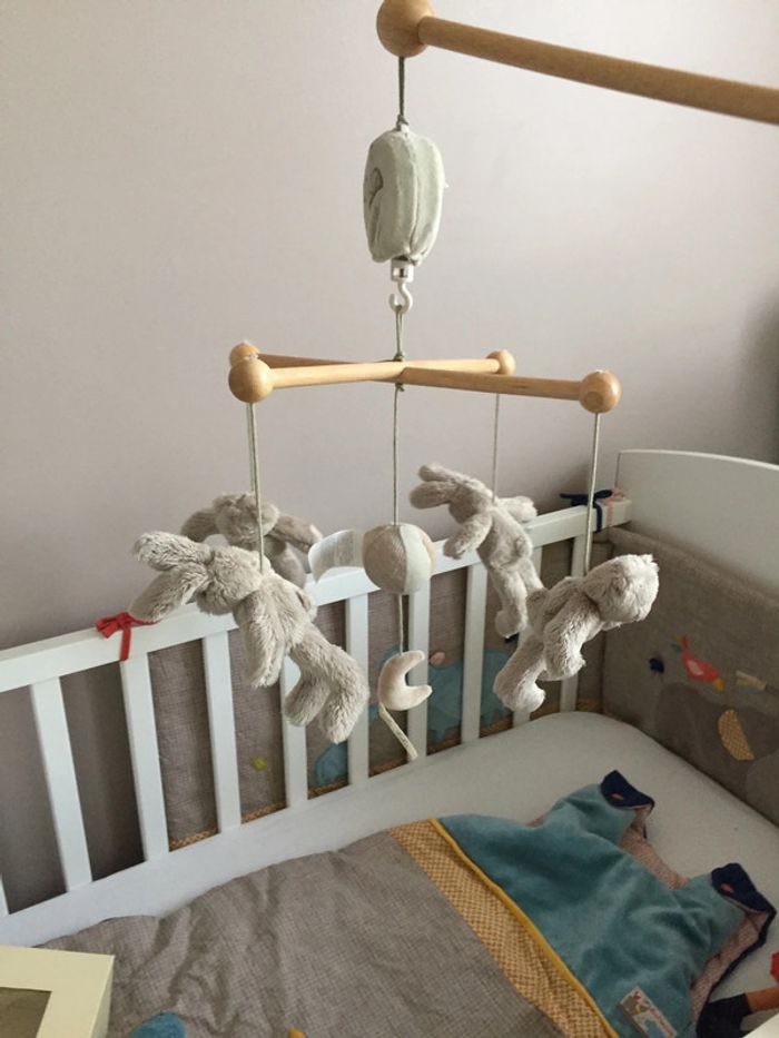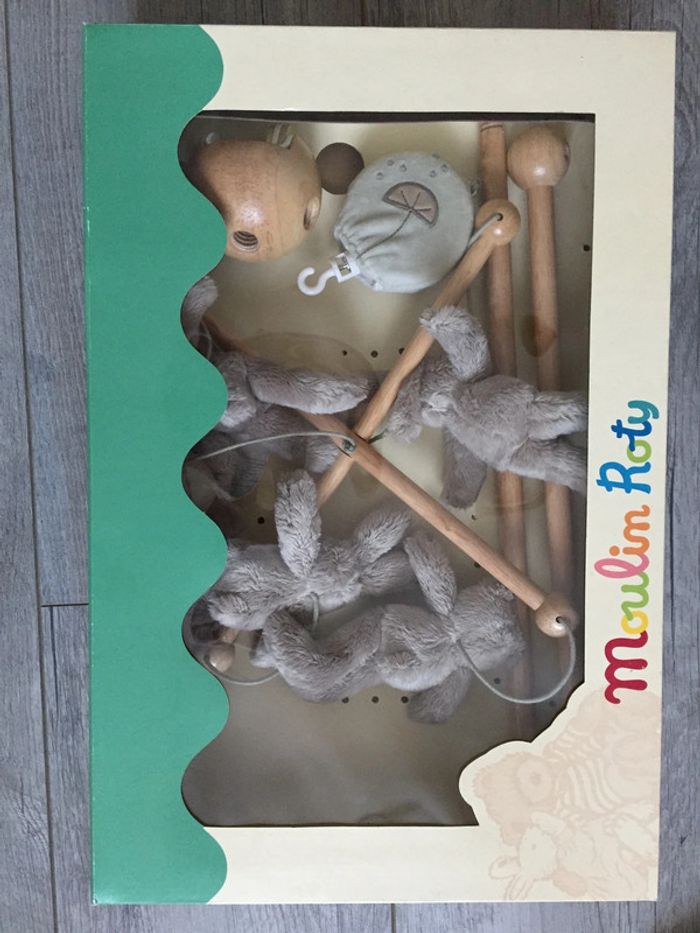 Mobile musical moulin roty Basile et Lola avec boîte TBE En bois Mixte Peut s’accrocher sur le bordure du lot sans l’abîmer Vidéo en fonctionnement possible sur demande