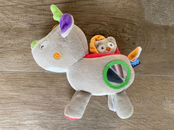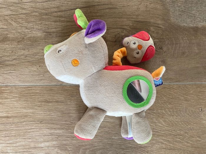 doudou peluche cerf renne élan + hibou gris rouge vert Sucre d’orge 21cm Pliure sur miroir sinon état neuf (jamais servi)