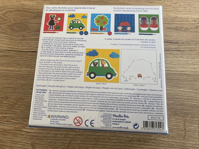 Jeu de cartes à lacer Marque : Moulin Roty. Idéal pour développer la motricité fine des petits. Jeu neuf et emballé Carte chaussure pour apprendre à faire ses lacets 4 ans et +