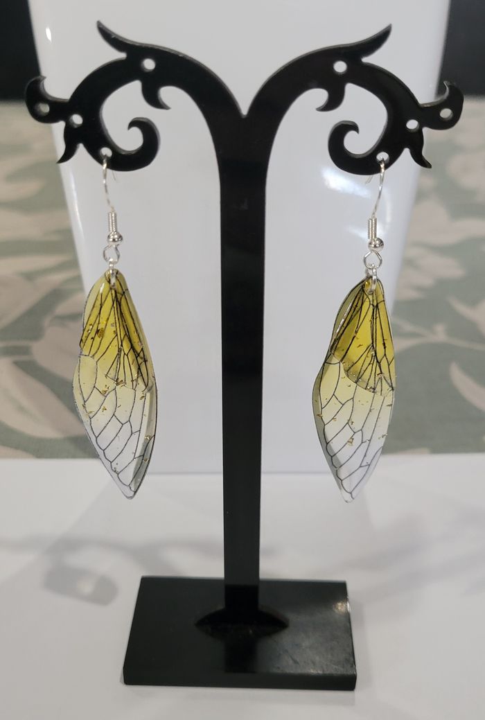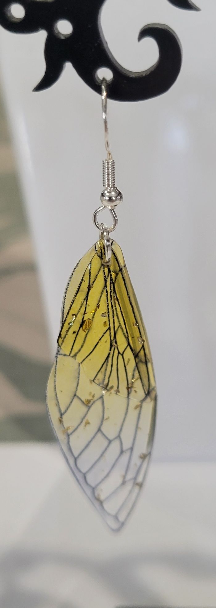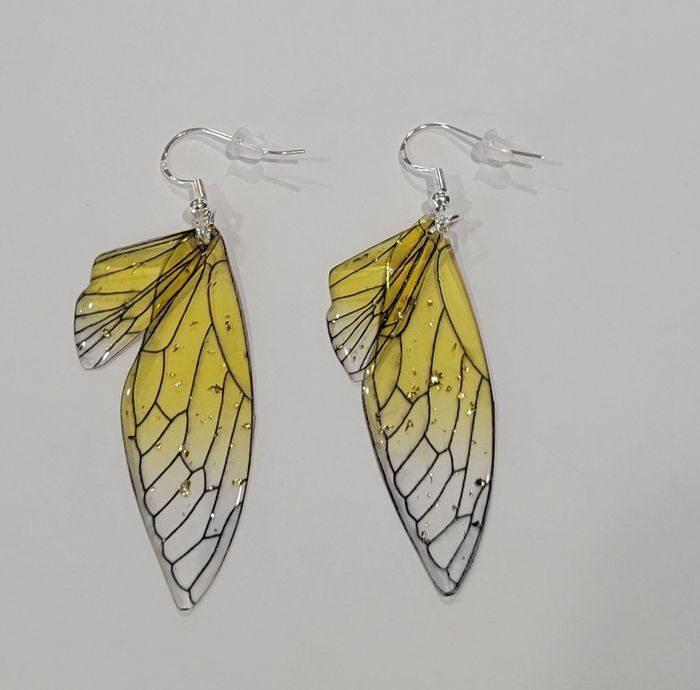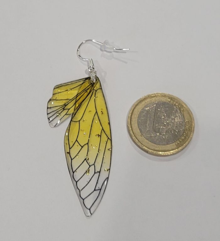 1 jolie paire de boucles d'oreilles motif ailes de fée/ papillon. attache coloris argenté .les ailes sont tout en transparence degradé jaune, rainures noires + paillettes dorées. . Hauteur totale : 6,8 cms .