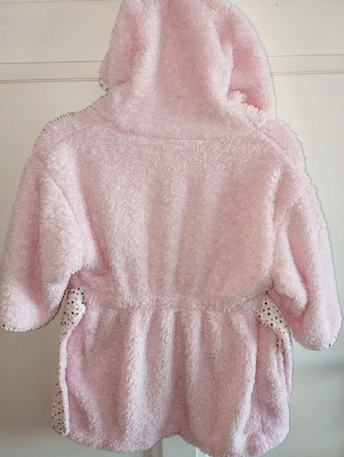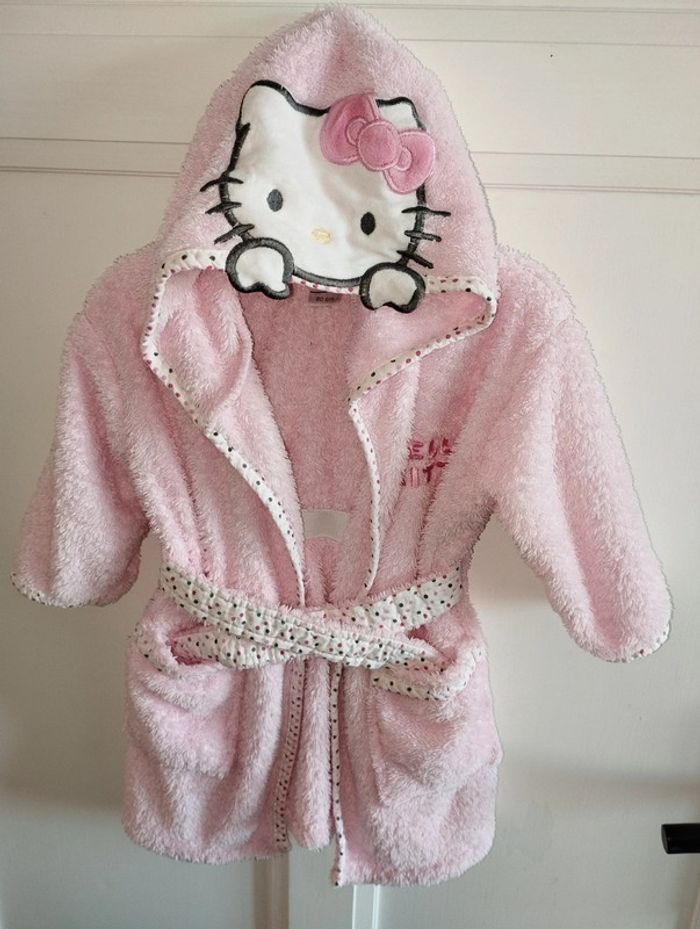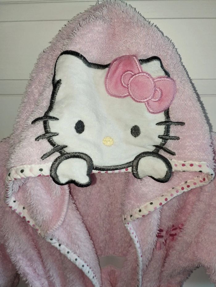 Peignoir Hello Kitty rose avec ceinture intégrée. Capuche. Excellent état. Marqué 80cm soit 12-18mois mais finalement taille petit donc à utiliser entre 9 et 12 mois.