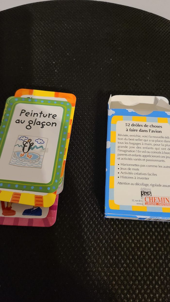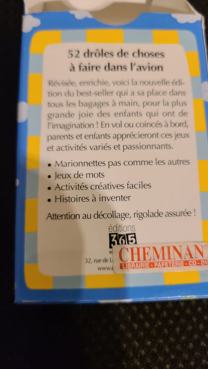 52 drôles de choses à faire dans l'avion Pour les enfants de 7 à 12 ans. Jeu de 52 cartes, au format poche. Une solution ludique, originale et inédite sous forme de cartes pour ne plus s'ennuyer pendant les longs trajets en avion ou en salle d'embarquement ! Des activités créatives faciles à réaliser, des histoires à inventer, des jeux de mots qui raviront petits et grands ! Son petit format vous permet d'avoir recours à ces activités dès que vous le souhaitez ! À mettre impérativement dans son bagage à mains !