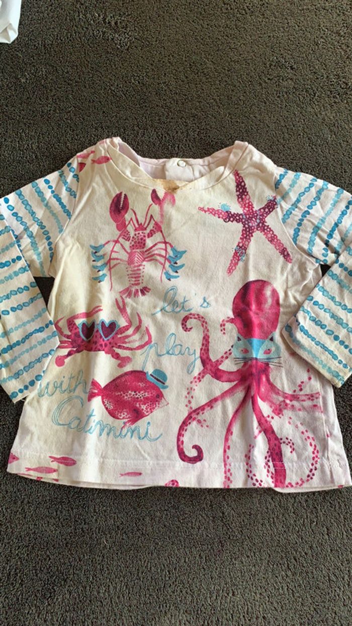 t-shirt de fond blanc à motifs marque catimini taille 12 mois bon état une tache au niveau du col ( voir photo) fermeture pratique à l’arrière à l’aide de trois pression #ggilloisrenon_fille_12mois code rangement 244