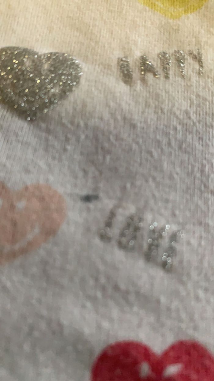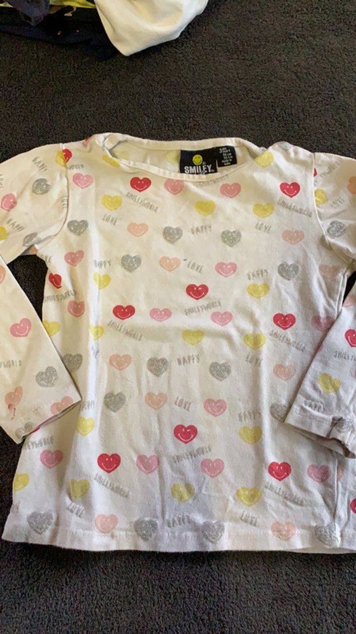 t-shirt manches longues blanc avec motifs petit cœur bon état une toute petite tache sur le devant ainsi qu’une manche (voir photo) marque smiley Word taille trois ans #ggilloisrenon_fille_36mois code rangement 211
