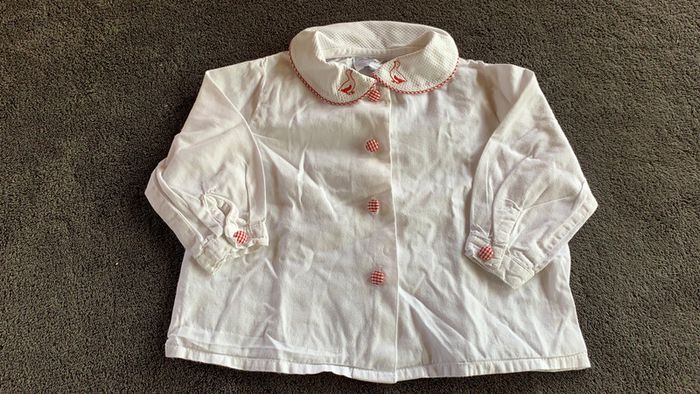 chemise Cyrillus blanche avec petits motifs doigts sur le col et liseré rouge fermeture par bouton ambiance Vichy taille six mois #ggilloisrenon_fille_6mois code rangement 159