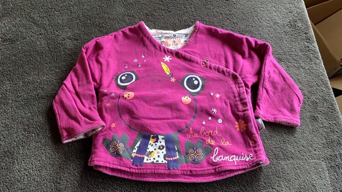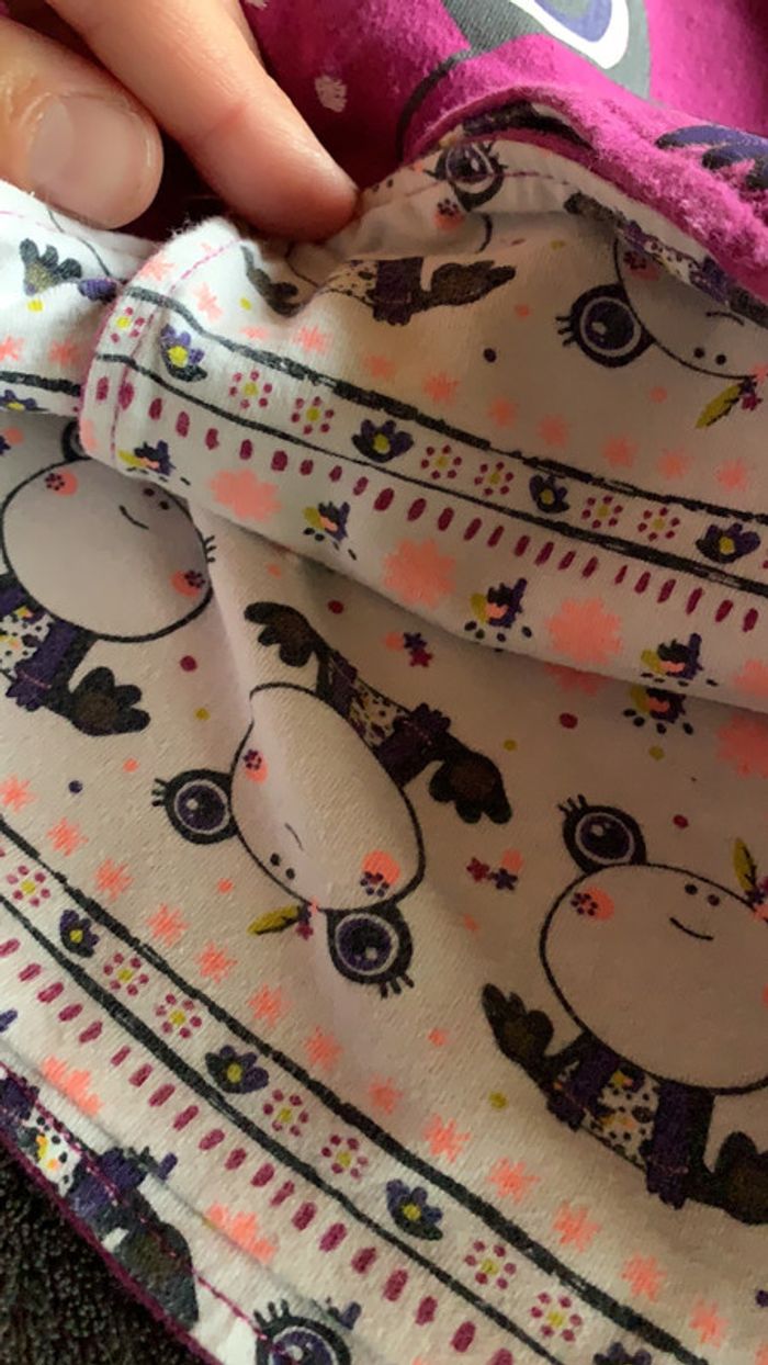 Gilet violet et blanc motif rigolo marque petit béguin taille neuf mois fermeture à pression. intérieur avec motif rigolo. #ggilloisrenon_fille_9mois code rangement 80