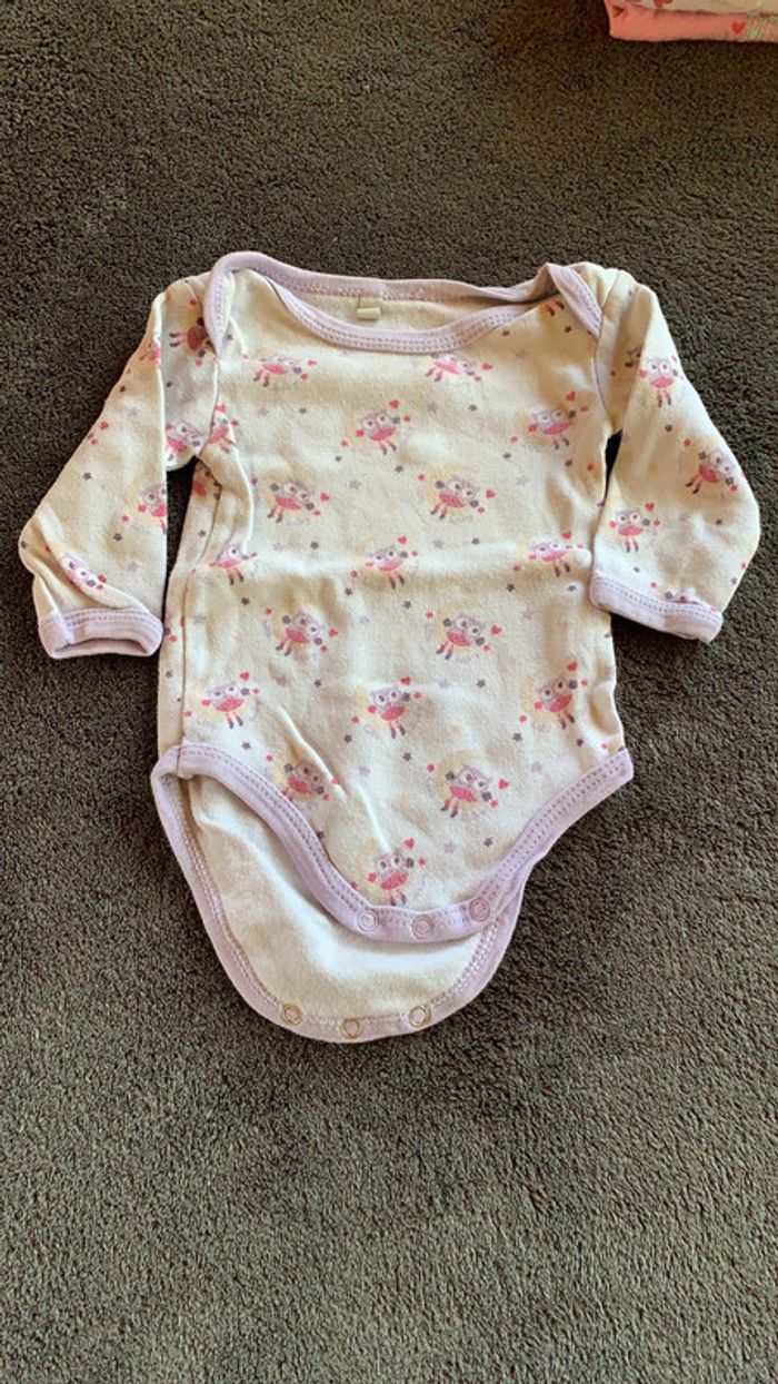 body manches longues couleur blanc et violet avec des petits hiboux très bon état aucune tache ni aucun trou pas de marque apparente mais acheté chez orchestra taille trois mois 62 cm. #ggilloisrenon_fille_3mois code rangement 21