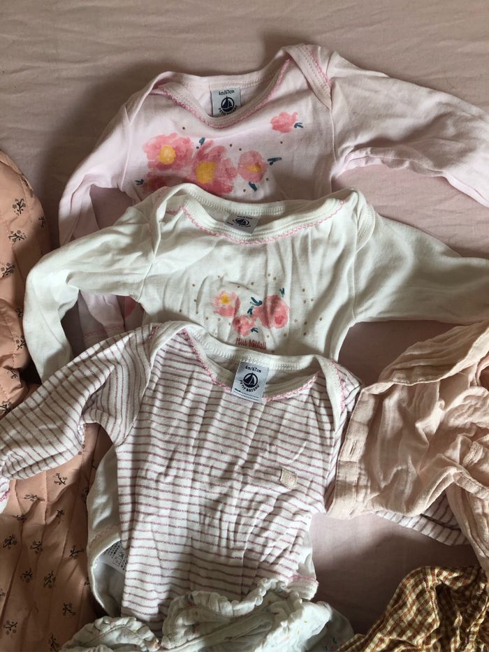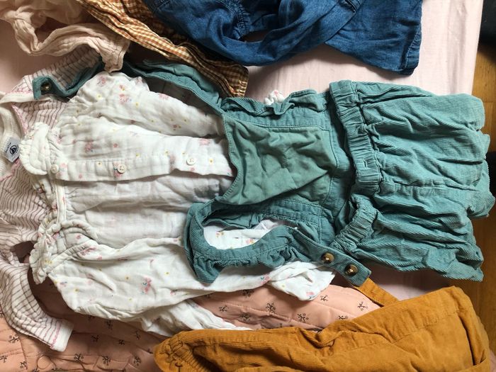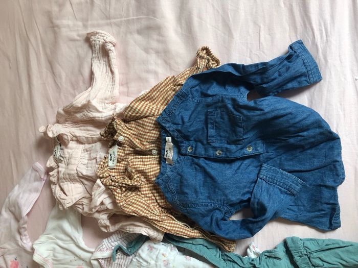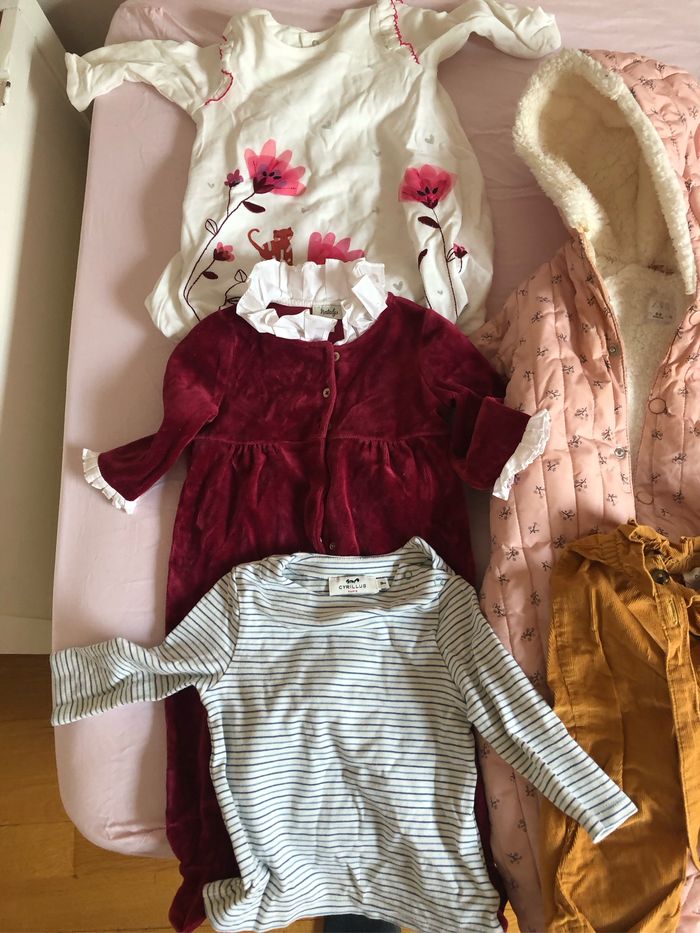 3 bodies manches longues petit bateau , 5 hauts/chemises ainsi qu une salopette cyrillus, une doudoune Zara, et un ensemble velours natalys. Très bon état, excepte une petite zone tachée doudoune, voir photos