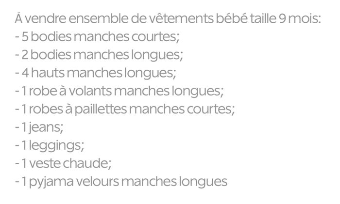 A vendre un lot de plus de 15 vêtements taille 9 mois. En bon et très bon état.