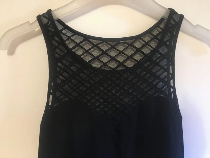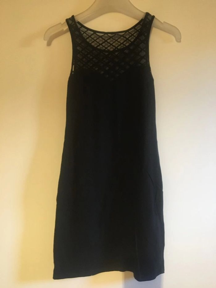 Robe noire, moulante, arrive à mi-cuisses. Décolleté en transparence. Taille XS.