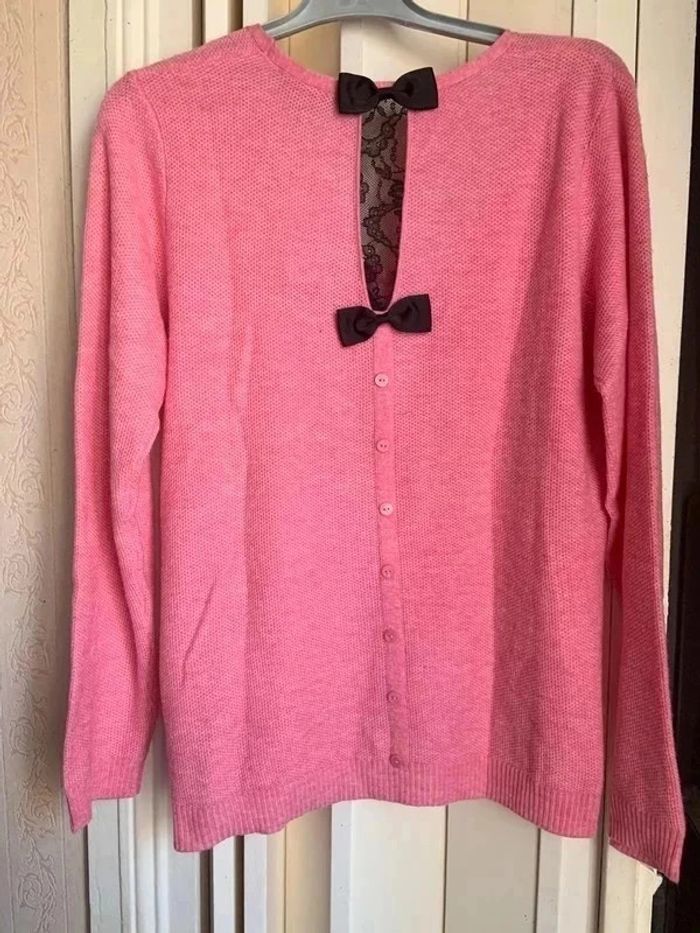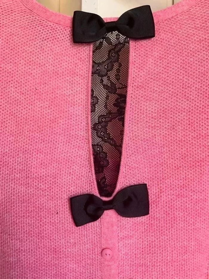 Pull rose manches longues boutonné au dos Etam Deux petits noeuds noirs dans le dos taille L Composition : 60% polyamide, 35% polyester et 5% laine Neuf avec étiquettes #lilli1407_pull