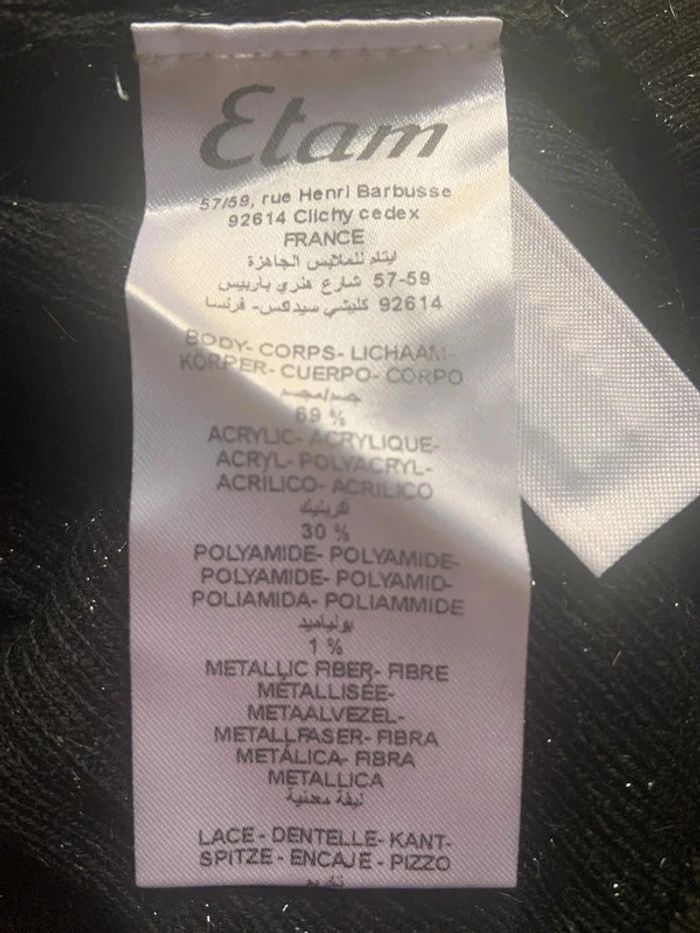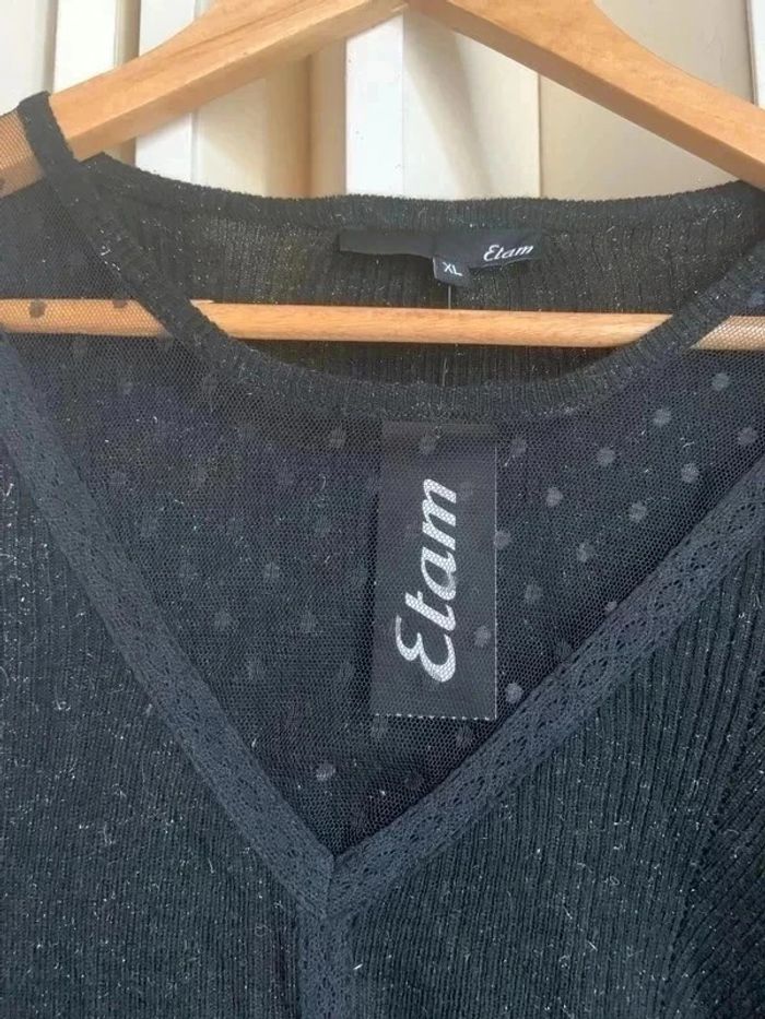 Pull fin Etam Noir pailleté Taille : XL Empiècement en dentelle , encolure V 69% acrylique, 30% polyamide, 1% fibre métallique Neuf avec étiquette #lilli1407_pull