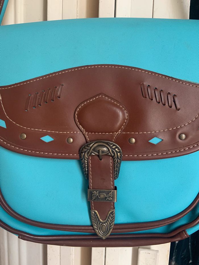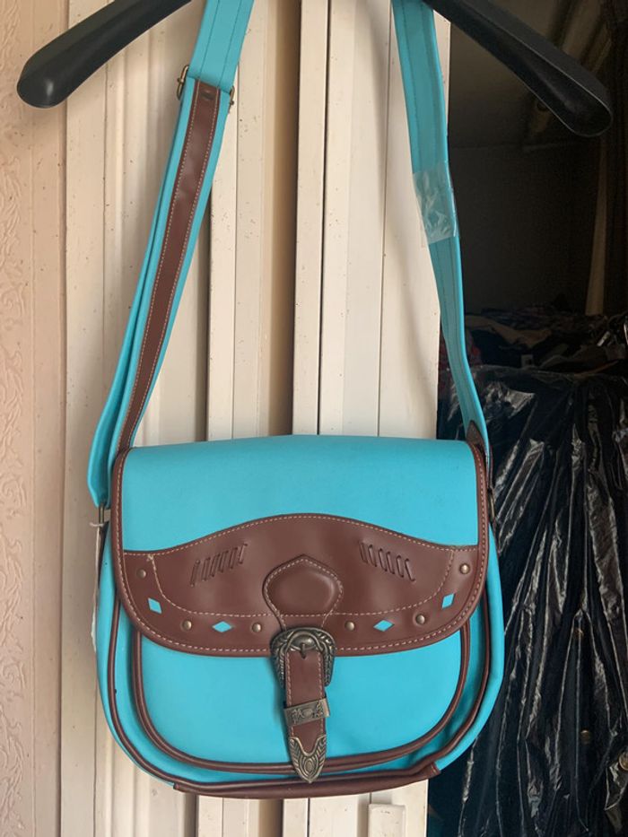 Besace esprit western Marron et bleue Fermé par bouton aimant Bandoulière réglable Une poche plaquée au dos Neuve jamais servie