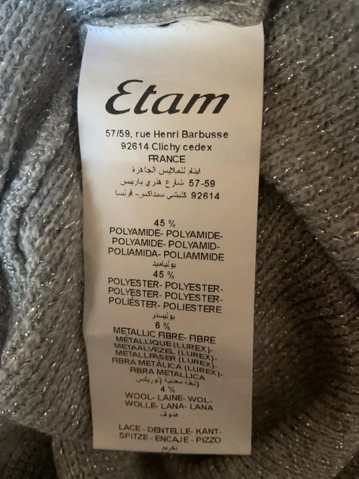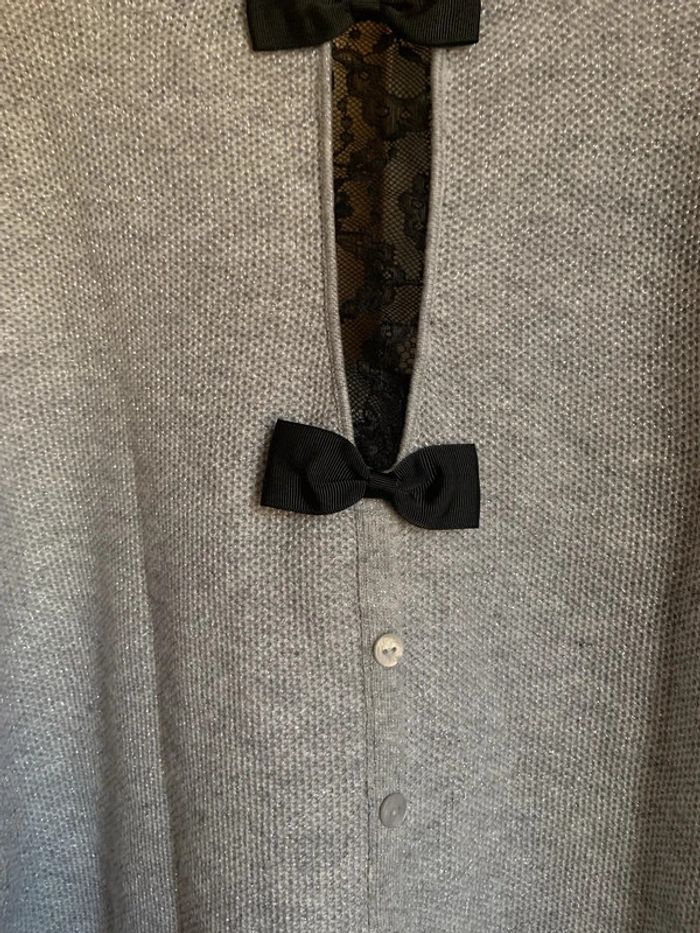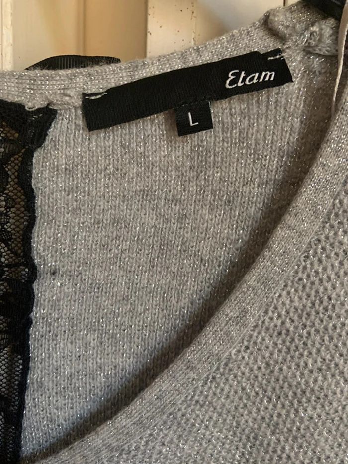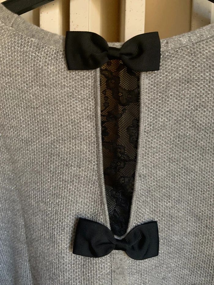 Pull gris manches longues boutonné au dos Etam Deux petits noeuds noirs dans le dos taille L Composition : 45% polyamide, 45% polyester, 6% fibre métallique (murex) et 4% laine Très bon état #lilli1407_pull