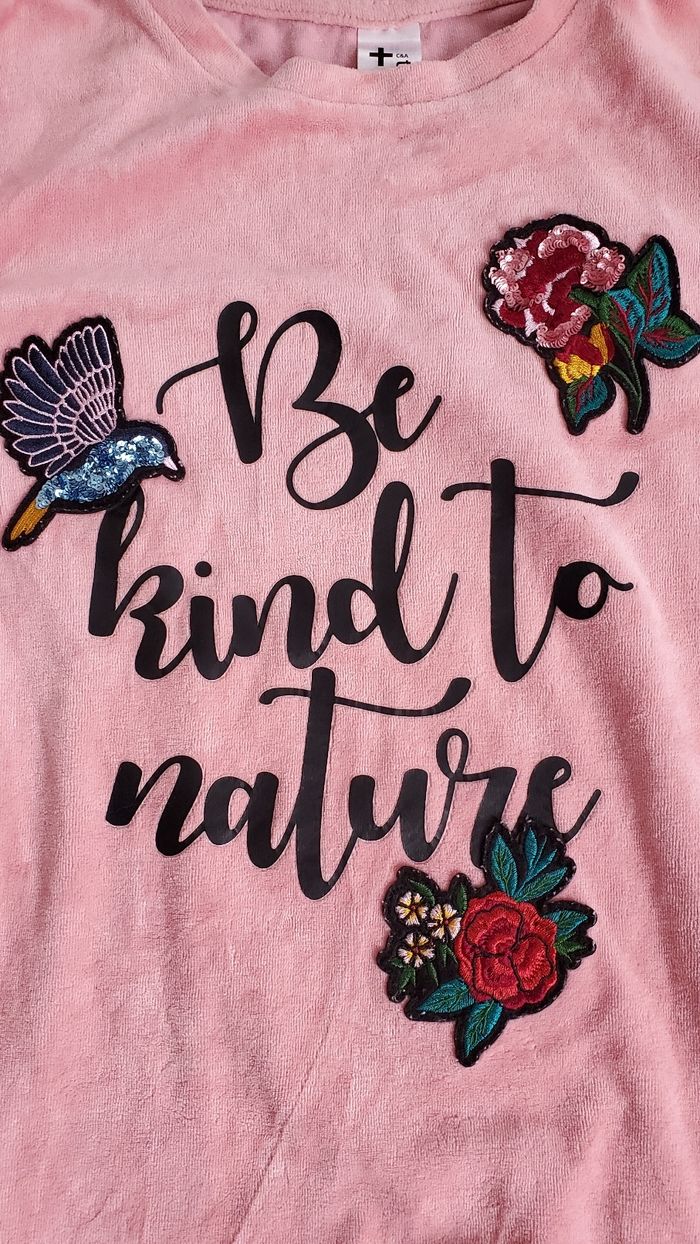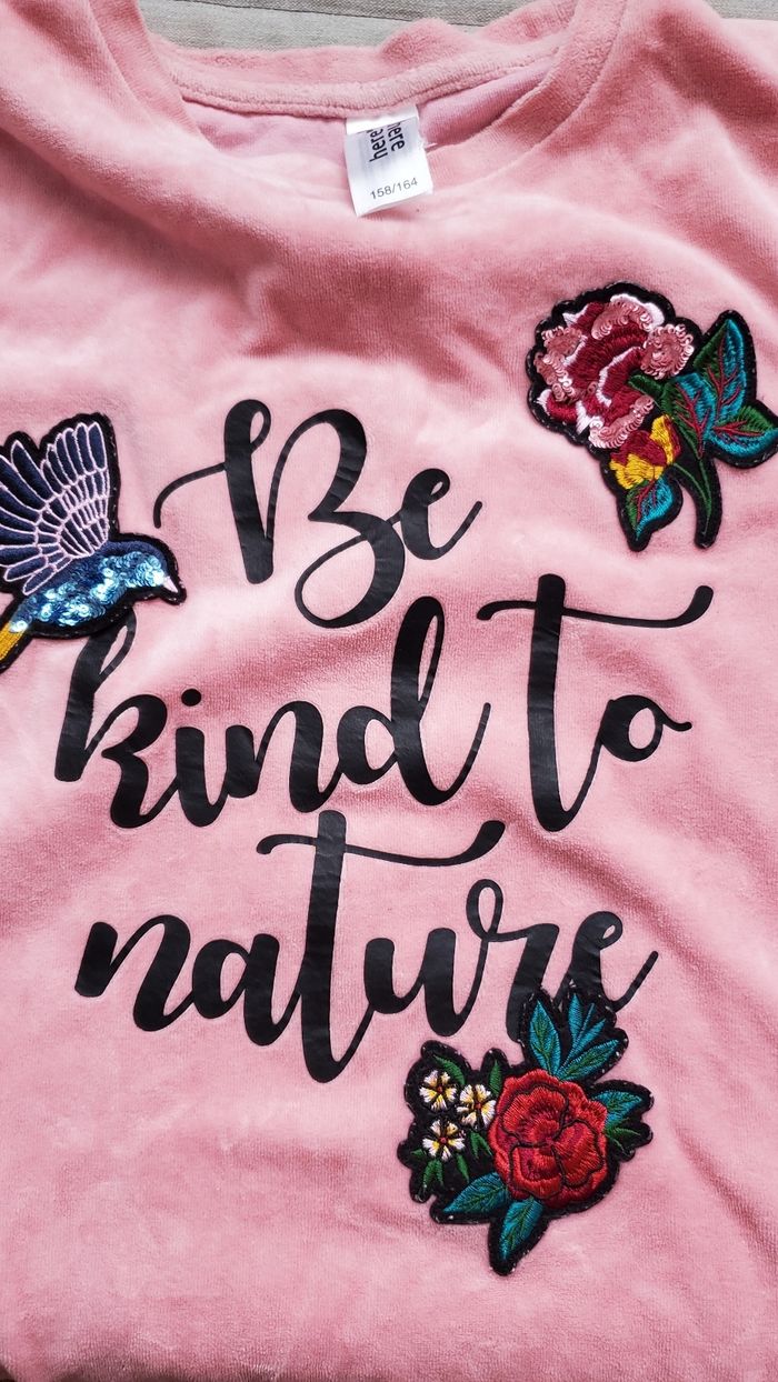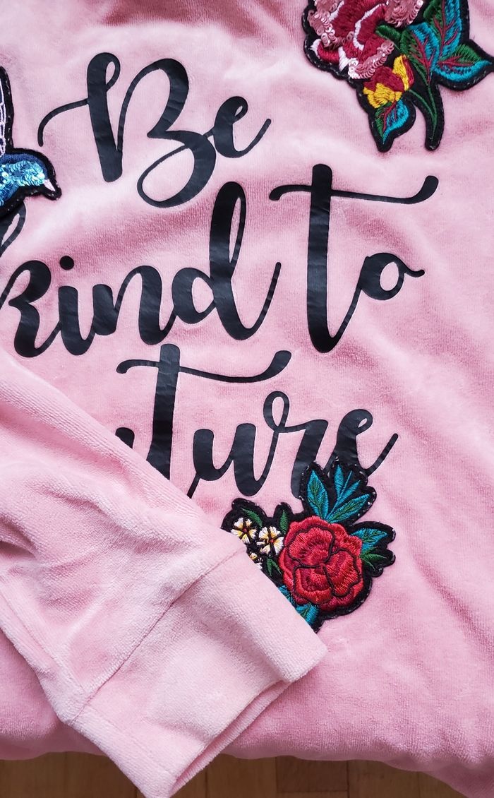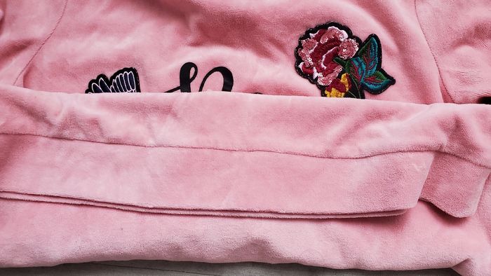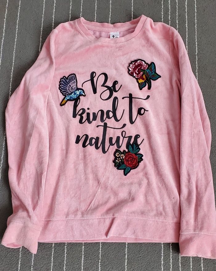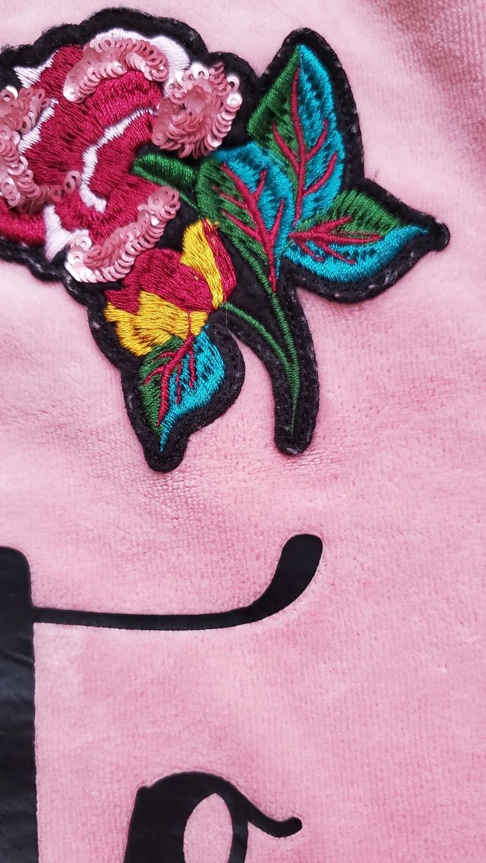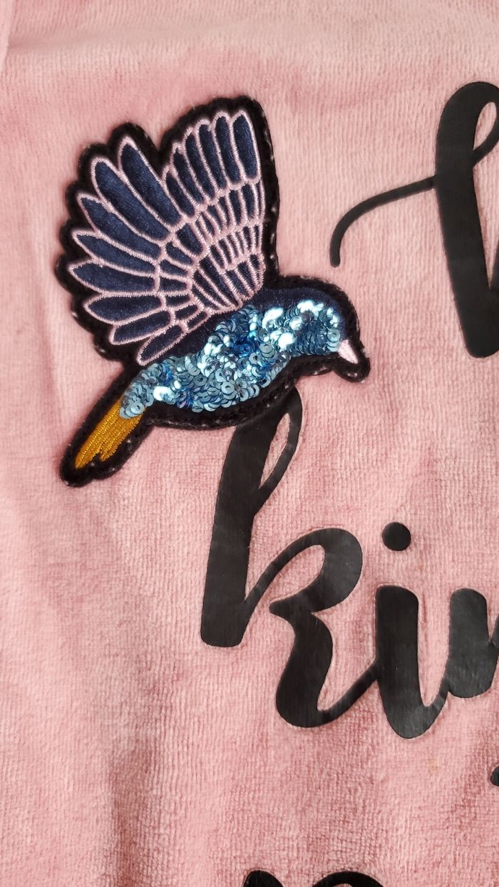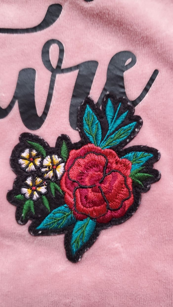 Joli sweat avec patches et strass touché velours très doux. 75 % coton.