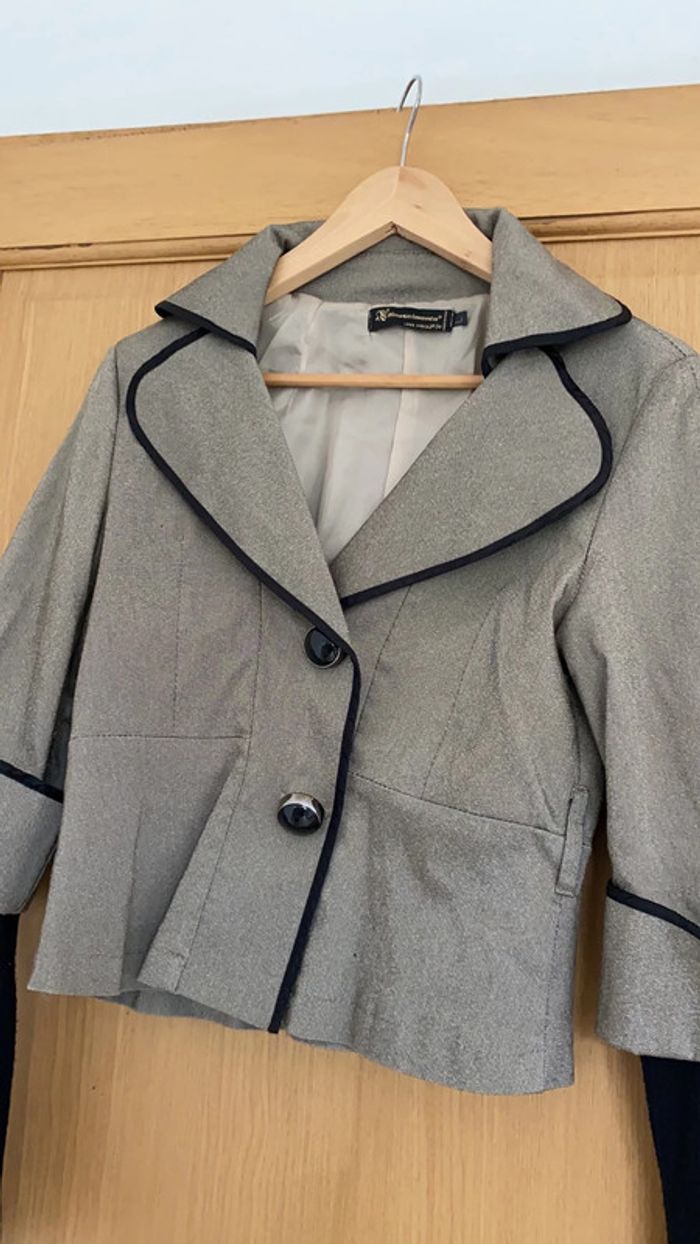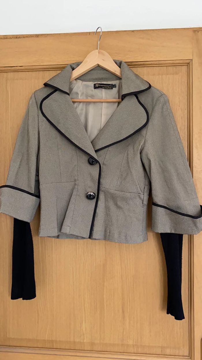 veste grise brillante effet : manche 3/4 avec pulls écrit L mais taille M