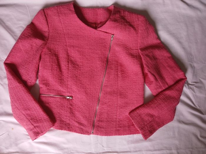 Jolie veste rose avec fermeture sur le devant et 1 poche sans marque.
