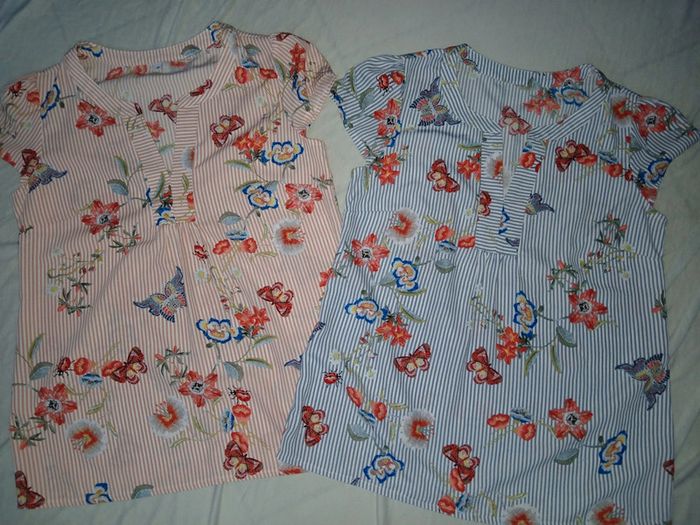 En lot 4€ ou à l'unité 2€ Blouse rayée 1 rose/orange 1 bleu motif papillon Taille 38 Sans marque