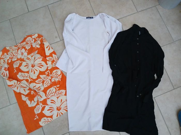 En lot 10€ ou à l'unité 1 robe vintage orange sans marque sans étiquette avec 1 tâche à la manche 2€ 1 robe blanche boohoo voile sur les épaules et matière élastique taillé grand 32 4€ 1 robe chemise noire taille 34 nafnaf 4€
