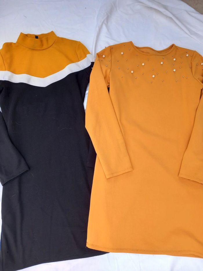 En lot ou l'unité Robe jennyfer moutarde et noir petite tache sur le col 2€ Robe jaune moutarde avec perles 4€