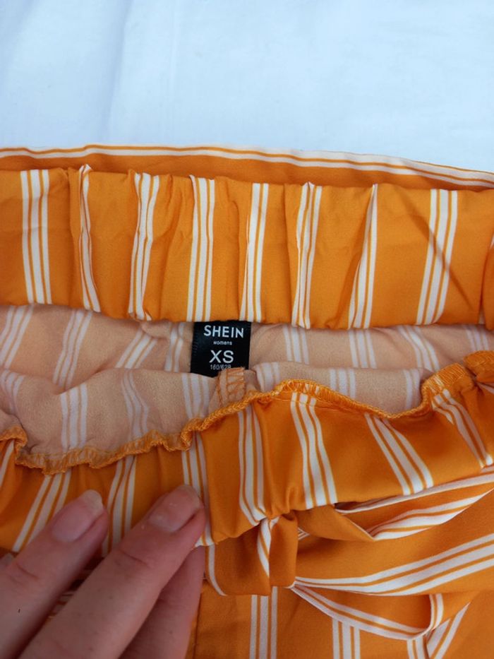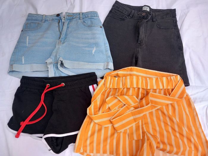 En lot ou à l'unité short marque kiabi shein en taille xs 1 noir avec bandes sur le côté 1€ 1 jaune rayée blanc shein 3€ 1 en jean bleu kiabi 5€ 1 en jean noir kiabi 5€